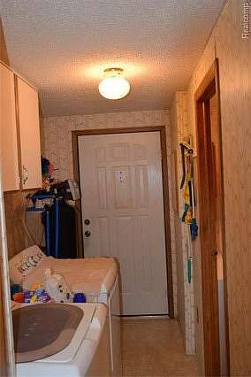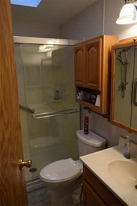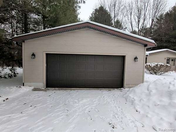 This is a manufactured home on land, built in 1990, with vinyl siding, forced air heat, no central A/C, and a slab foundation. A two-car attached garage and multiple storage sheds give you all the space you need for lake toys, tools, and everything Up North life requires.