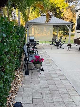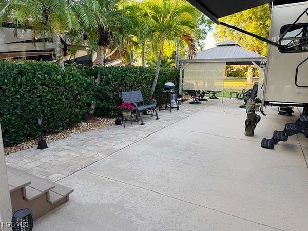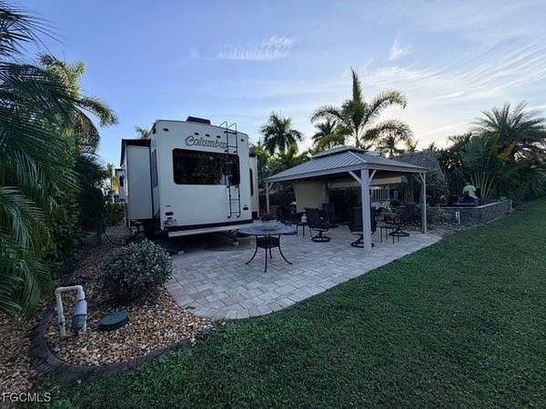 Lot 388 is a concrete south facing back in lot that can accommodate any type of RV. It sits on a quiet street called prairie Iris trl, In Cypress Trail RV Resort. The side yard and the back patio area is paved with neutral colored pavers. Some of the plantings on this lot are Sylvester Palms, Sago palm, Holly, Manila palm and some cocoa plums for privacy. There is a 12 x 14' metal gazebo complete with some crank down shades for more privacy, a ceiling fan and patio lights surround the ceiling area. This has survived two hurricanes so is very stable. Also on the Lot is an Amazon 8 x 15' shed with a toilet and a sink. The rest of the shed is unfinished so you can custom finish it to your needs. Any storage of personal property property is very easy because you have twin double doors on the shed. The rear patio area offers even more relaxing space in a super large open green space to the north where there are no neighbors close by and the green space gives you an opportunity to walk your dog directly from this lot to the dog park. The lot is very convenient to the clubhouse for activities and is also right down the road to the garbage and recycling area. Don't miss this very pleasant lot competitively priced. Call Jim for additional information.