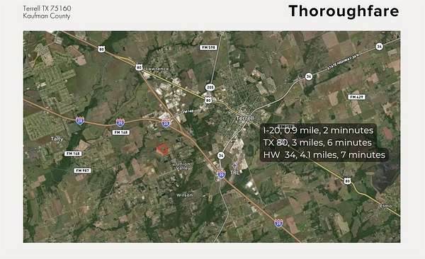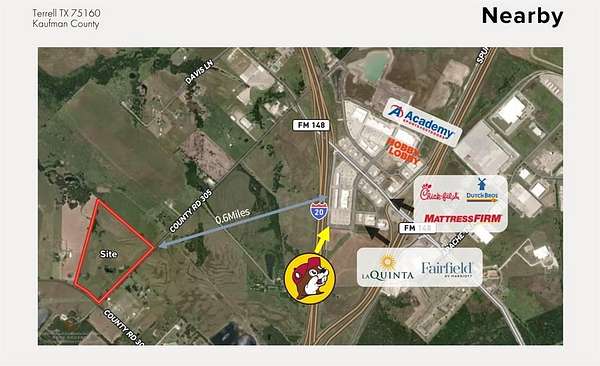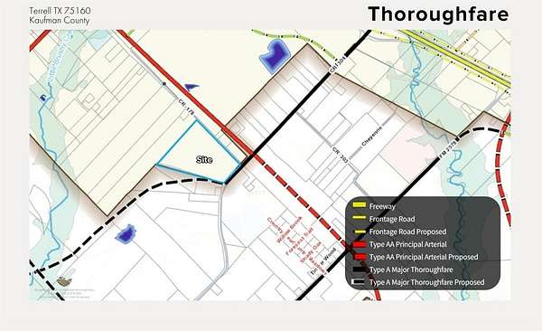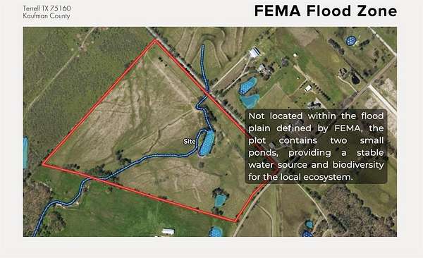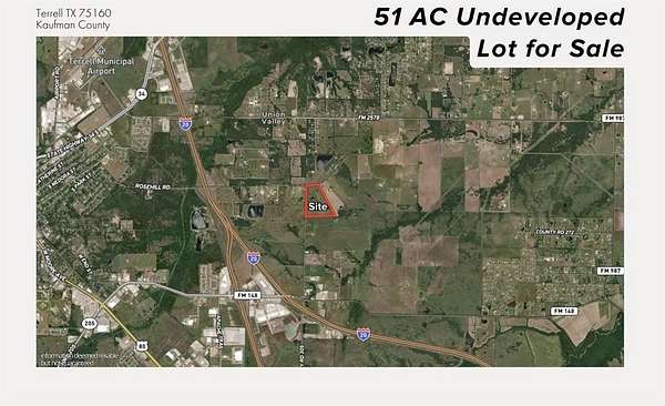 Prime development opportunity with +-51 acres of unrestricted land located within the city limits of Terrell in fast-growing Kaufman County. This tract features approximately 700 feet of frontage along County Road 304 and is situated outside FEMA-designated floodplains. The property includes two natural ponds, Ideally positioned just 0.9 miles from I-20, 3 miles from Highway 80, and 4.1 miles from Highway 34, providing excellent access to major transportation corridors. Surrounded by rapid residential and commercial growth, including high-end subdivisions, Baylor Scott & White Medical Center (1.6 miles), Terrell Municipal Airport (4.2 miles), and new industrial developments such as Blue Star Land's 180-acre project. Utilities nearby and proximity to top-tier retail and employment centers make this an exceptional opportunity for residential, commercial, or mixed-use development.
