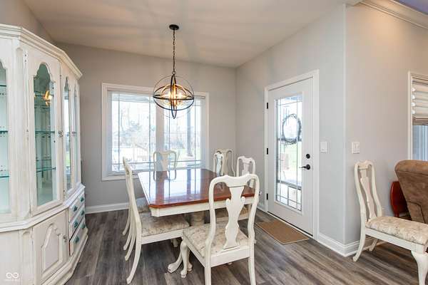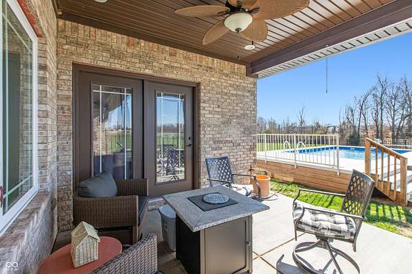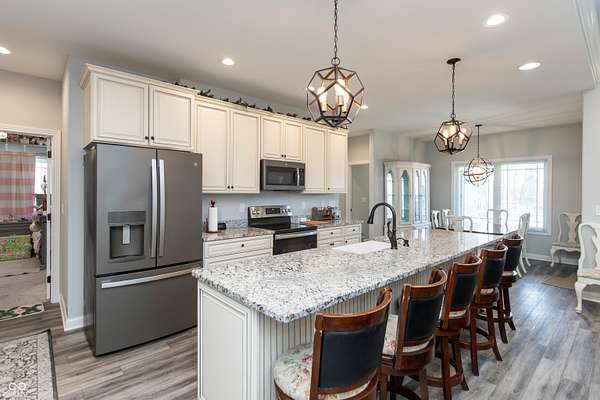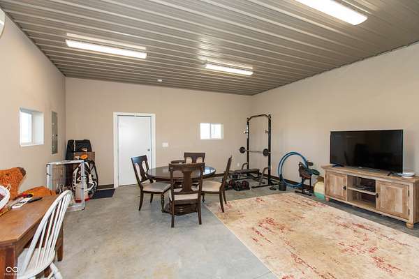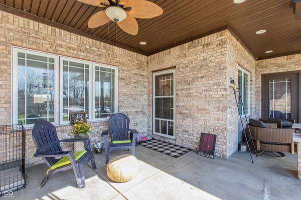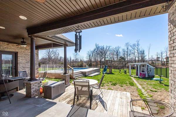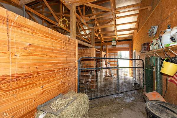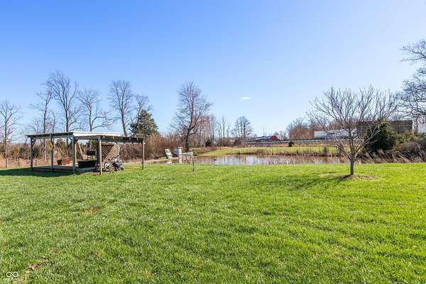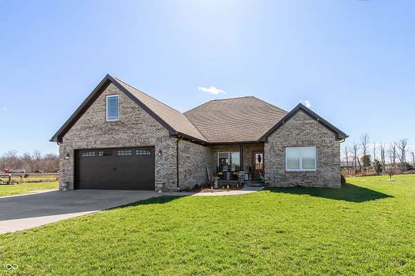 Country living at its best with this 4 BR, 4 BA custom-built brick 1.5-story home situated on more than 6 ACRES with stocked pond; convenient to Seymour and Columbus, this home offers an open floor plan with more than 2,700 sq ft of living space; 40x30 pole building features two 12x12 tongue and groove horse stalls and tack room plus fenced pasture with two gates and woven-wire fencing; pole building also features a 28x19 party/rec room with half bath, refrigerator and Mitsubishi mini-split system; GE-applianced kitchen comes complete with gourmet island, granite countertops, farmhouse-style sink, breakfast bar, walk-in pantry and lots of cabinets with soft-close drawers and doors; breakfast room accesses covered rear porches; living and dining room accented with crown molding and gas fireplace flanked by built-in bookshelves; split-bedroom floor plan offers two primary bedrooms each highlighted by tray ceilings with crown molding, walk-in closets and private baths with double-sink vanities and tiled walk-in showers; each of the primary bedrooms accesses the covered rear porches; split-bedroom floor plan also includes two remaining bedrooms with one bedroom offering built-in shelving and private bath; main level of home features ladder doors and 9-ft ceilings; 23x11 BONUS ROOM on 2nd level of home would be ideal for kid's space or in-home office; main-level laundry room with GE washer and dryer; covered front and rear porches; metal-fenced back yard with recessed Kayak above-ground swimming pool and deck; stocked pond; apple, peach, pear and cherry trees plus grapes, blackberries and raspberries; Seymour/Redding school district.