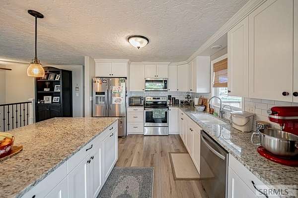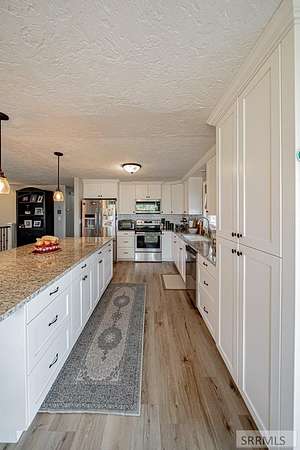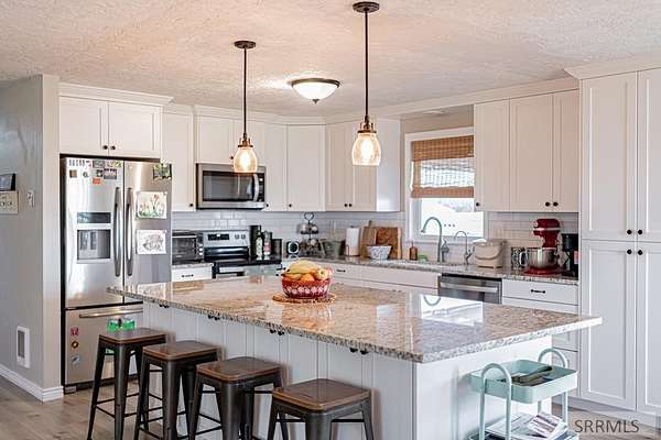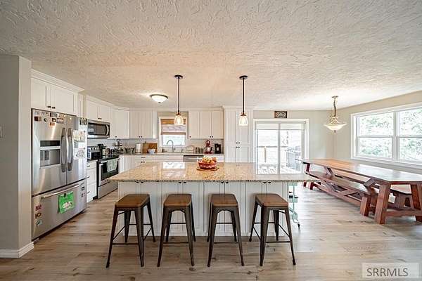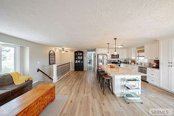 Experience elevated country living in this exceptional Shelley property, where generous living spaces and upscale finishes create an atmosphere of warmth, comfort, and quiet sophistication. Thoughtfully designed for both everyday living and refined entertaining, the main level offers 2 bedrooms, including a spacious secondary bedroom, along with a full bath. Upstairs, the private primary suite serves as a luxurious retreat, while 2 additional bedrooms provide flexibility for guests, hobbies, or additional living needs. The upper level is the heart of the home, featuring an expansive living area and a beautifully appointed kitchen anchored by a massive granite bar that makes a striking statement and invites gathering. An open sitting and dining area, dedicated office, and versatile bonus spaces enhance both the functionality and elegance of the layout. Rich in character, the home is warmed by a wood stove that adds charm and ambiance, while cadet heating in key areas provides added comfort. With granite finishes, spacious room sizes, and a distinctive floor plan, this property offers a rare combination of luxury, privacy, and timeless appeal in a desirable Shelley setting. Information deemed reliable, but not guaranteed. Buyer to verify all information independently.