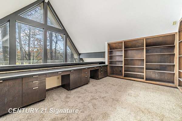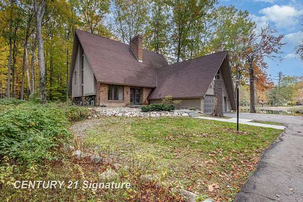 Welcome to 10363 Lakewood Dr., a beautiful and private retreat tucked away on 1.6 acres with 260 feet of lake frontage. This unique chalet-style home offers 4 possible bedrooms, 3 bathrooms, and 3,586 square feet of living space. The architecturally distinctive design features floor-to-ceiling windows that capture stunning lake views from every level, fill the home with natural light, and showcase the upscale finishes throughout. It's designed for easy entertaining with two kitchens, dining, and living areas. You'll love the spacious and private primary suite with custom storage, the cathedral ceilings, two fireplaces, an attached garage, and so much more. A newer built pole building adds lots of extra storage, and the home includes three furnace zones, and a dumbwaiter for added convenience. This property is truly exceptional, don't miss your chance to make it yours!