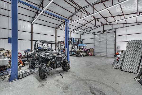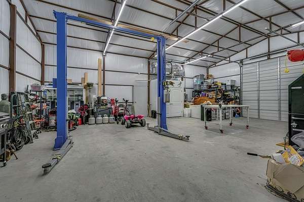 Step outside to a large covered patio overlooking breathtaking sunset views and a stocked pond, perfect for relaxing or entertaining. The property also boasts a 40x30 insulated workshop with electricity, two roll-up doors, a half bath, and an 11,000-lb vehicle lift, ideal for car enthusiasts or hobbyists.