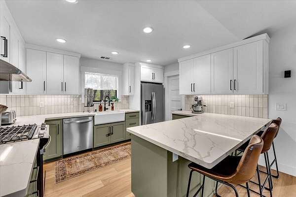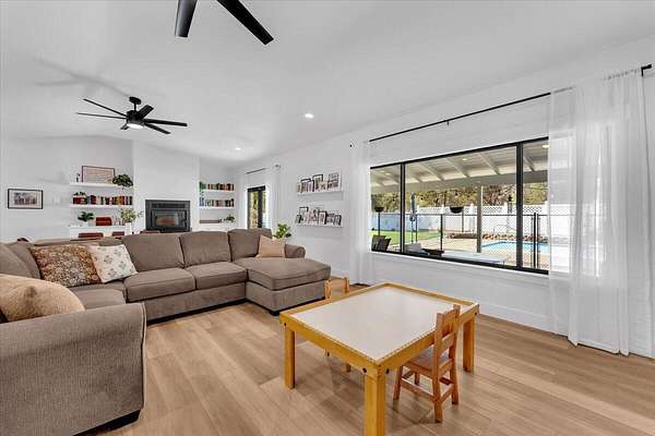 Inside, you'll find a vaulted great room with a cozy wood-burning stove, a gourmet kitchen featuring quartz countertops, custom soft-close cabinetry, walk-in pantry, and new Milgard windows that fill the space with light. The primary suite boasts a coffered ceiling, spacious walk-in closet, and a spa-like tile shower. Throughout the home you'll find new LVP flooring, solid-core doors, upgraded hardware, and Cat 6 Ethernet hookups for high-speed connections.