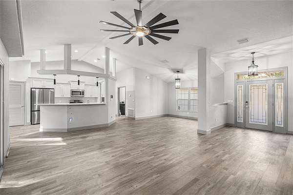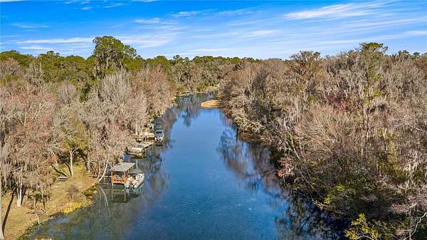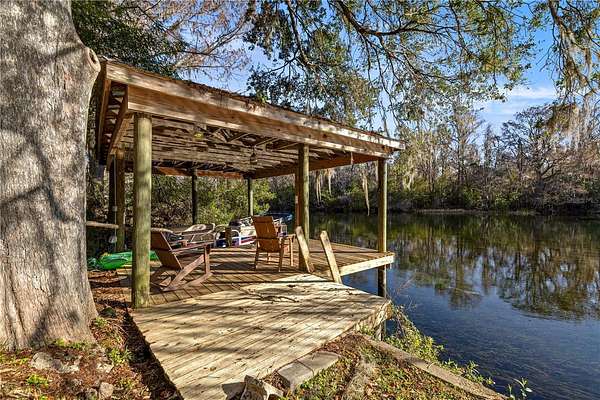 Welcome to luxury waterfront living on the infamous Rainbow River. This stunning concrete block 2023-built residence offers 105 feet of pristine river frontage, complete with a seawall & existing boathouse, creating the perfect setting for boating, kayaking, and enjoying Florida's natural beauty. Situated on 2.18 acres outside of a flood zone, this thoughtfully designed split-bedroom home features soaring cathedral ceilings, luxury vinyl plank flooring, and abundant natural light throughout. The open-concept layout includes a separate dining area and an eat-in kitchen. The spacious primary suite boasts double vanities and a private retreat feel, while generously sized guest bedrooms share a full guest bath. Additional highlights include an inside laundry room, oversized two-car garage, and a massive 24x20 covered back porch--perfect for relaxing and taking in breathtaking river views. A rare opportunity to own newer construction on one of Florida's most sought-after waterways. Schedule your private showing today.