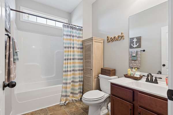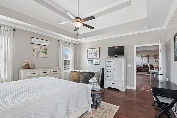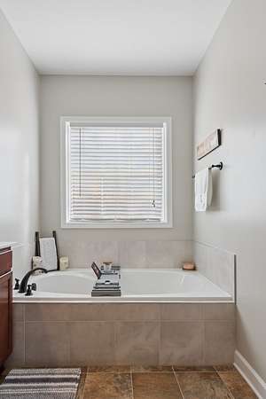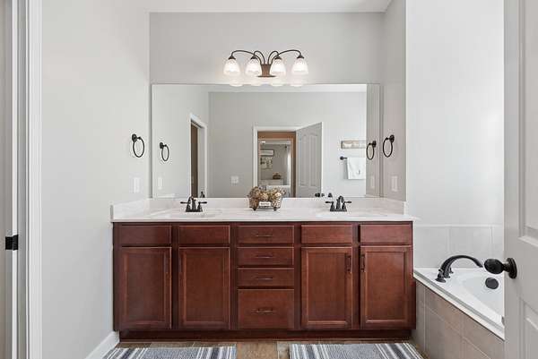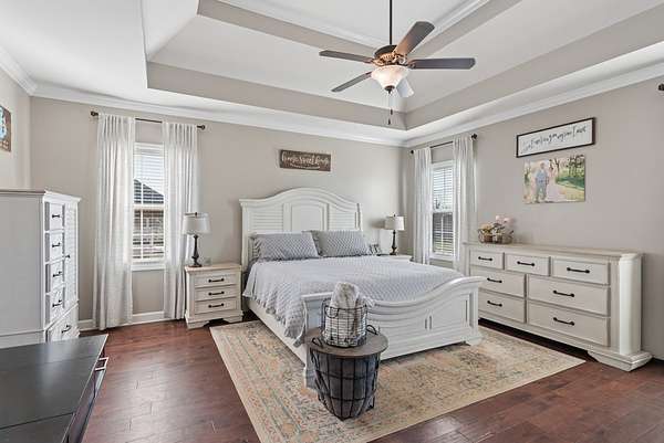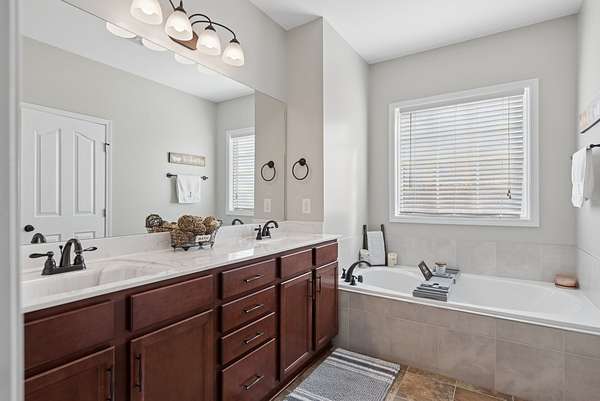 The primary suite is a retreat of its own — featuring double vanities, a soaking tub, an oversized walk-in shower, and generous walk-in closets. The additional bedrooms are thoughtfully positioned on the opposite side of the home, offering privacy for family or guests.