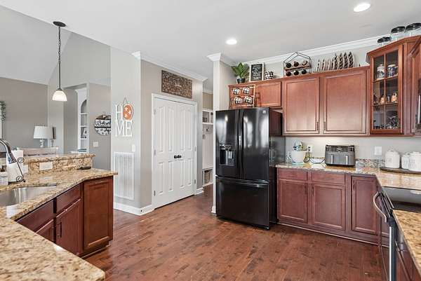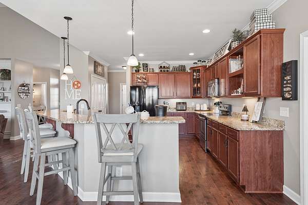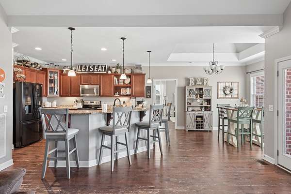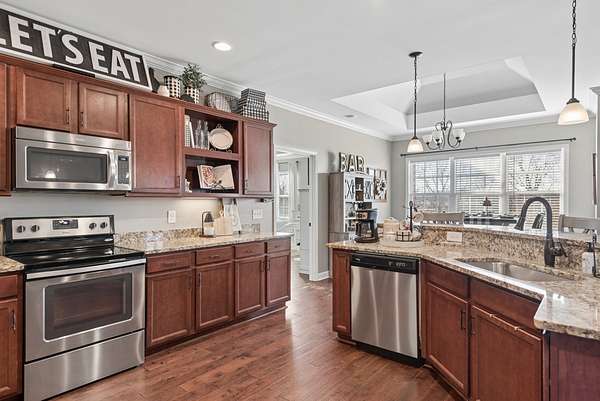 The kitchen? An entertainer’s dream. Stainless steel appliances, stunning lighting, a large pantry, and beautiful cabinetry make it the true heart of the home.