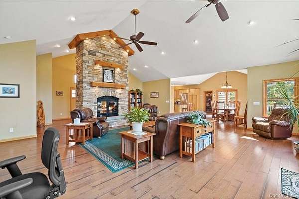This Contemporary Mountain Lodge offers the perfect blend of luxury and rustic charm. Step into this grand living space with cathedral ceilings, floor to ceiling windows and a stunning two-sided fieldstone fireplace. The gourmet kitchen features top-of-the-line appliances, custom hickory cabinets, black marble countertops and a walk-in pantry. Enjoy the convenience of a large mudroom, a 3 bay heated attached garage with a dog bath for your furry friends. An expansive finished room over the attached garage provides endless opportunities for housing guests in "bunk room" fashion, or as a large game/media room for entertaining. Need more garage space, no problem, because the property also has a detached 3 bay heated garage. The attached and detached garages are both equipped with 220 Volt outlets for EV charging stations and special LED lighting to highlight your many vehicles. Experience ultimate comfort with Geothermal radiant heated hardwood floors and a 30KW Generac generator ensuring your home is always powered. Relax on the 60 ft wrap-around Timbertech deck or at the stocked fishing pond. Spend your nights on the back flagstone patio around the built in fire pit with family and friends. This 56 acre estate includes a .25 acre 9 ft. fenced area for gardening with a small orchard of apple and pear trees. Property boasts approximately 10 acres of 9 ft. fenced-in land suitable for livestock. Light Sport Aircraft, Horse and livestock friendly land. EQUIPMENT THAT CONVEYS WITH THE PROPERTY: Polaris Ranger, Kubota ZD323 Zero Turn Additional Information: Amenities: Storage, Parking Features: 3 Car Attached, 3 Car Detached