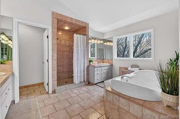 Upstairs, the primary suite features soaring ceilings and a large ensuite bath with dual vanities, Jacuzzi tub, and separate shower. Three additional generously sized bedrooms and a full bath complete the upper level.