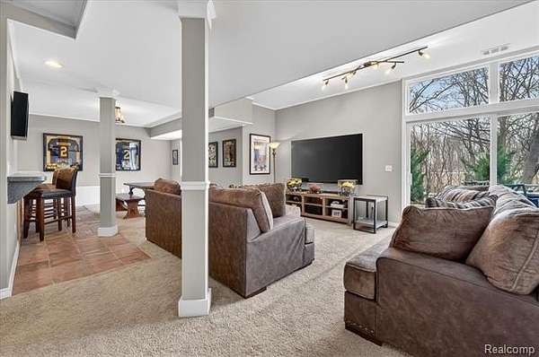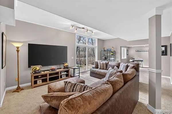 The finished walkout lower level provides excellent additional living space with a full bath, large living area, wet bar, and bonus room that can serve as a guest room, exercise room, or flex space.