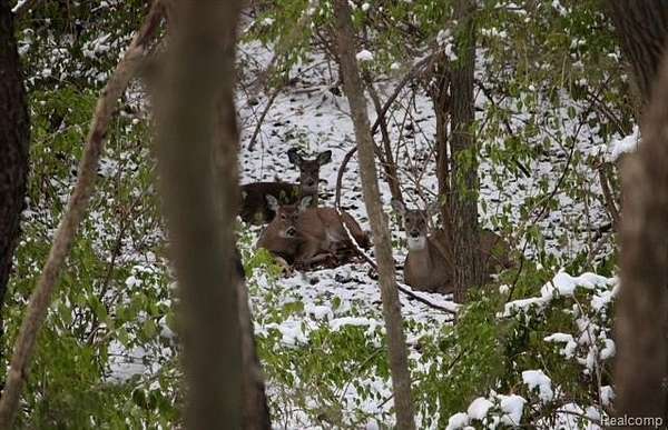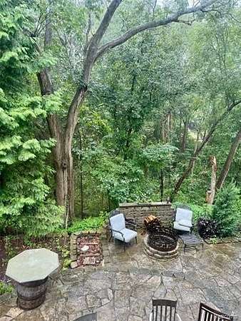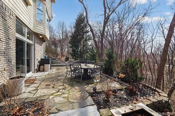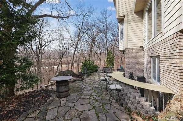 Step outside to the flagstone patio with a fire pit and bar area. During the warmer months, the backyard transforms into a lush, tree-filled setting as the surrounding woods fully leaf out, creating a beautiful natural backdrop with frequent visits from local wildlife.”