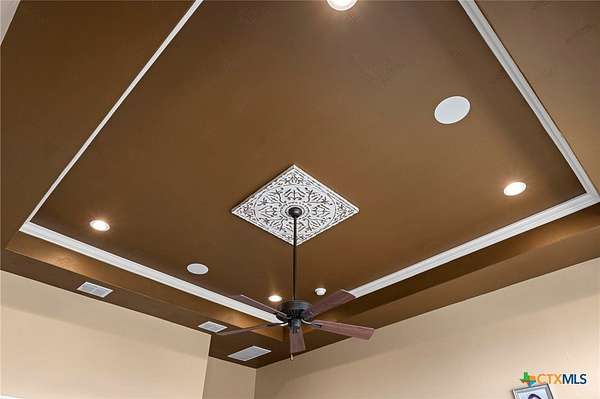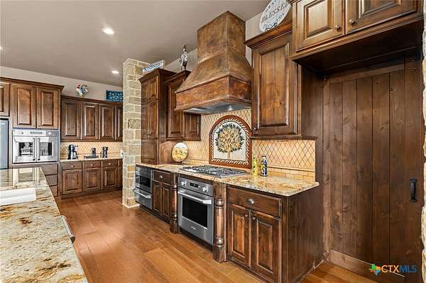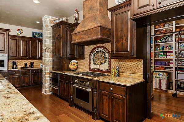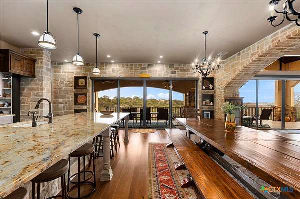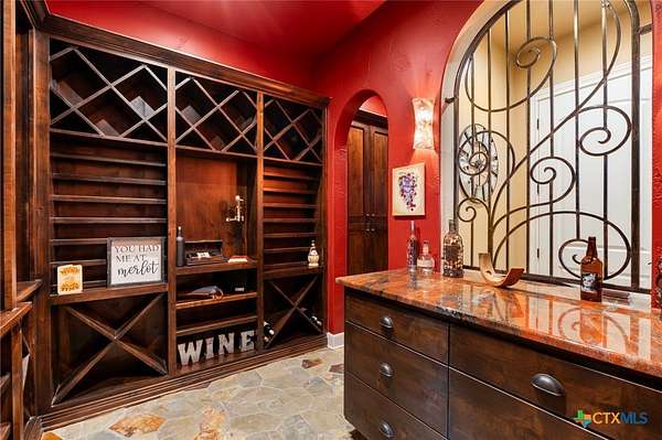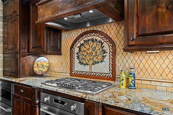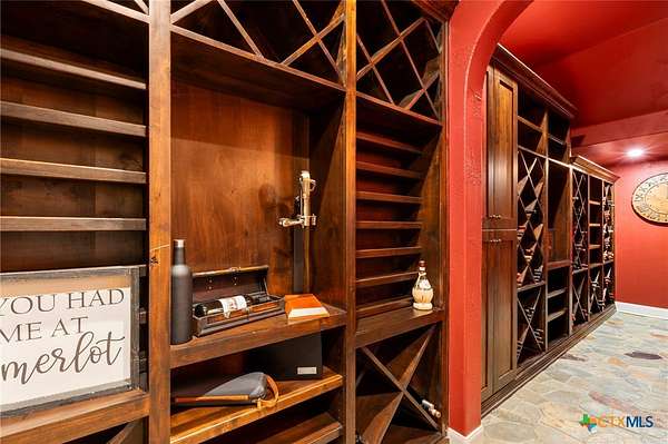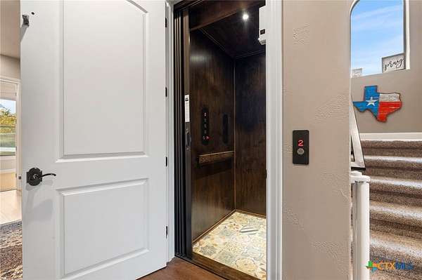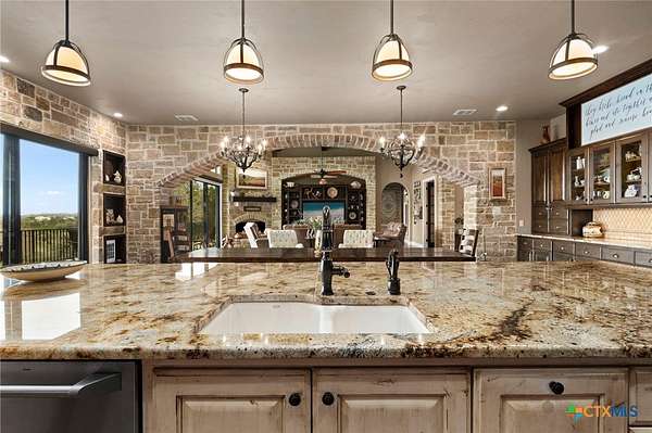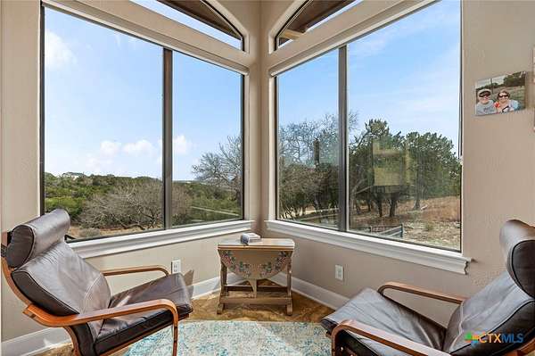 Set on 3.14+/- private acres within Mystic Shores, 1039 Bluewater Place offers an exceptional Hill Country living experience with sweeping canyon views toward Canyon Lake and thoughtfully designed spaces across three levels and more than 8,000 square feet. This 5 bedroom, 6 bath residence blends architectural presence with everyday livability. The open concept living, dining, and kitchen areas are framed by soaring ceilings and expansive windows that capture long-range views. A chef's kitchen features an exceptional 14-foot granite island, custom cabinetry, artisan finishes, and a large walk-in pantry, designed to anchor both entertaining and daily life. Designed for flexibility, the home includes a library office, a third-level studio workspace, a game room, exercise room, wine grotto, and a bunk room that comfortably sleeps eight. Elevator access connects all three levels, complemented by two staircases for ease of movement throughout. The primary suite offers a peaceful retreat with spa bath featuring towel warmers and generous walk-in storage. Additional conveniences include a large laundry room with upper level chute, whole house audio, custom built-ins, and climate-controlled third-level storage often referred to as a Texas basement. Outdoor living spans two levels of covered porches overlooking the canyon and lake, along with a resort-style pool and spa, expansive cool deck, firepit seating area, and outdoor kitchen. Additional features include a 4 bay garage, pool equipment room, 4 HVAC systems, wall safes, transferable termite barrier system, and remote monitored fire and security system. The property has recently been independently appraised at $3.5 million, reflecting the scale, design, and setting of this Hill Country estate. Located within Mystic Shores, residents enjoy access to Canyon Lake, community amenities, nature preserves, and trails while remaining within reach of San Antonio, New Braunfels, and Austin.