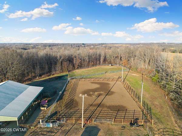 Turnkey 46-acre horse farm offering a complete, well-designed training facility. Improvements include a 60x80 covered arena with lights, sand footing, and two 20-ft side sheds, plus a separate outdoor arena. Eight total stalls-4 located off the covered arena and 4 inside the main barn, including three oversized 14x14 stalls ideal for foaling or studs and one 8x10 stall. Custom Armour Horse Stalls fronts with automatic watering system utilizing PEX piping, along with a dedicated feed room and tack room. Additional features include a six-horse walker, 30x50 hay barn, six run-in sheds, and frost-free hydrants to each pasture. Multiple fenced pastures provide excellent turnout. Attached to the barn is a comfortable barndominium with 1 bedroom, 1.5 baths, full kitchen, and laundry. New water well system installed in 2024. Ample room for future stall expansion within the covered arena, plus a separate potential building site already equipped with septic, water, and electric. Gated entrance. Move-in ready and built for year-round equestrian use.