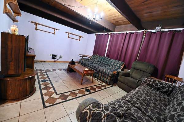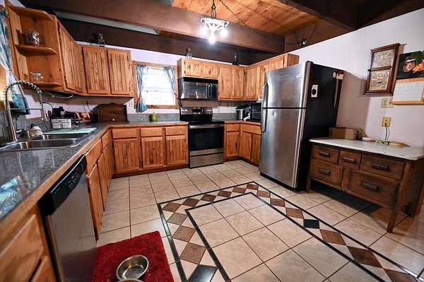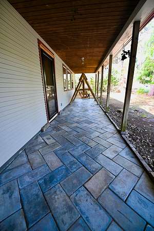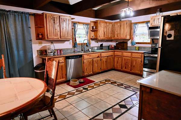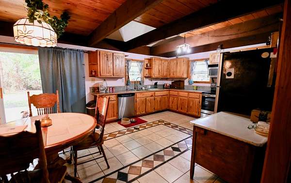 Spacious 3-4 bedroom, 2 full bath home offering over 1700 sq. ft. of living space on 2.3 acres. Interior features include ceramic and wood flooring, custom-built kitchen cabinets, and fresh interior paint in progress. A new steel roof was installed in 2025 for added value and peace of mind. This property is equipped with area for pellet stove, providing efficient heating options throughout the home. There is a 12' x 16' new deck. In addition to the main residence, the property includes a 5000+ sq. ft. aluminum building offering ample space for business use, storage, or a variety of other purposes. An additional stone outbuilding houses a wood burning furnace should you desire Hydronic Heating. This adds even more heating flexibility and functional space. Property offers both comfortable living and excellent potential for work, storage or hobby use. Home entry is coded. You will need to call to get code. SentriLock is on barn door with key to door. No power inside barn, so you will need a flashlight when showing. Seller is offering $2,000.00 concession for interior paint.