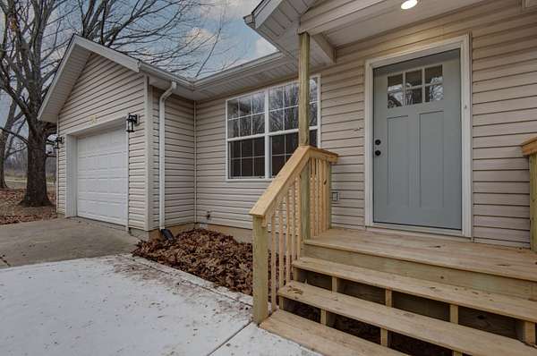 Welcome to this beautifully updated 2-bedroom, 2-bath home situated on 1.5 private acres in a peaceful country setting. Surrounded by mature forest, this property offers exceptional privacy while remaining just 2.7 miles off Highway 65--making commutes to Branson, Ozark, or Springfield quick and convenient. Inside, the home features custom upgrades throughout, including hand-scraped vinyl plank flooring and farmhouse barnwood vanities with deep farmhouse sinks in both bathrooms. The kitchen is a true showstopper with a farmhouse sink, stainless steel appliances, quartz countertops, and a walk-in laundry room conveniently located nearby. The primary suite provides a spacious retreat, complete with an oversized walk-in closet offering abundant storage for your wardrobe and more. This home has been gone through inch by inch, reflecting quality craftsmanship and thoughtful improvements throughout.One of the standout features is the massive crawlspace--approximately 9 feet tall--with the subfloor fully insulated. This creates an exceptionally energy-efficient home with low utility costs, while also offering incredible potential for storage, a workshop, or additional utility use.Recent exterior updates include a new roof with transferable warranty and new decks, providing peace of mind for years to come. The 1.5-acre lot is surrounded by forest, yet includes a beautiful large open area ideal for a garden, future shop building, or a fully fenced dream backyard for your furry friends. Property is believed to border conservation land, further enhancing privacy and natural surroundings. This move-in-ready home blends modern farmhouse charm with peaceful country living--don't miss your opportunity to make it yours!