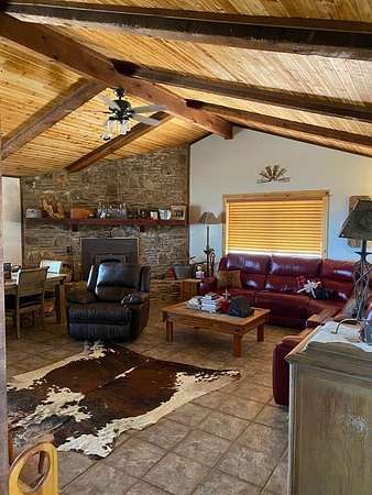 The septic system is only eight years old, and the property features a storage tank supporting the 525-foot-deep well, which draws from the reliable Trinity Aquifer. The home is topped with a well-maintained metal roof, and inside you'll find an electric fireplace with an insert for cozy evenings.
