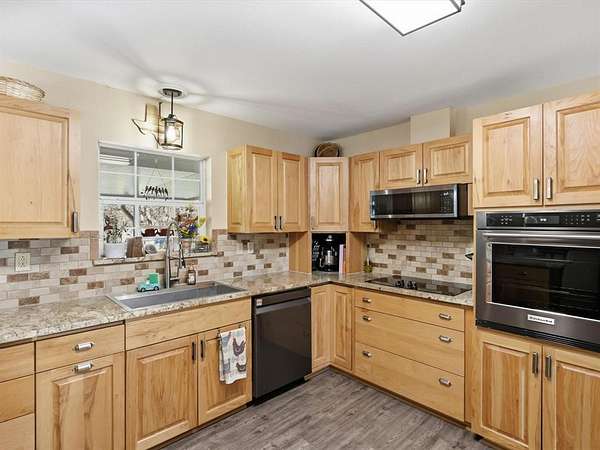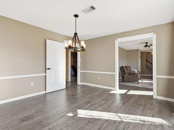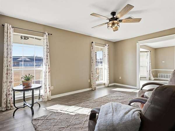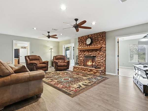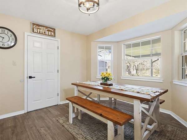 ASSUMABLE 2.25% MORTGAGE. Sitting on 5.5 acres, this well-maintained beautifully updated farmhouse-style property offers a flexible layout and a peaceful outdoor setting. The home includes four bedrooms and three and a half bathrooms, with several living and dining spaces designed for both everyday use and entertaining. A sunroom brings in abundant natural light and is connected to the main living area by a stone, double-sided fireplace. The kitchen features stainless steel appliances, upgraded cabinets, a breakfast area, and a built-in tech or workspace that adds convenience. The primary bedroom is generously sized and includes two closets and a renovated bathroom with a soaking tub, walk-in shower, updated tile, and dual sinks. Upstairs, two bedrooms each have their own bathroom, while an oversized fourth bedroom provides options for a game room, home office, or additional living space. Interior and exterior paint have been refreshed, and luxury vinyl plank flooring runs through the main areas of the home. Outside, a covered patio looks out over the pool and water feature, with a creek lining the rear of the property. A 36x24 powered workshop offers space for vehicle storage, an RV, or a boat, and an additional carport provides extra covered parking or room for equipment. This property combines open land, functional spaces, and a relaxed country atmosphere.