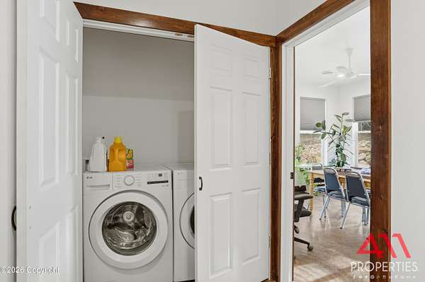 Wake to peace and privacy on this Wyoming homestead among the trees, bordered by BLM land north and south. Built in 2024 on unzoned 40 acres, the 5 BD/3.5 BA, 5,420 sq ft home offers main-level living with an airy layout, radiant in-floor heat, sauna, and a kitchen with custom cabinetry, stainless appliances, walk-in pantry, and prep kitchen. Polished concrete floors anchor dining and living areas. The upper mother-in-law suite provides full living quarters with its own kitchen and laundry, while the main level features laundry in the primary suite plus a second laundry at the opposite wing. Covered front and back patios capture forest views, a heated drive leads to a finished 3 car garage, and the 42x64 shop/home with living quarters, 4 bay doors, camper plug-in, and shop adds function.