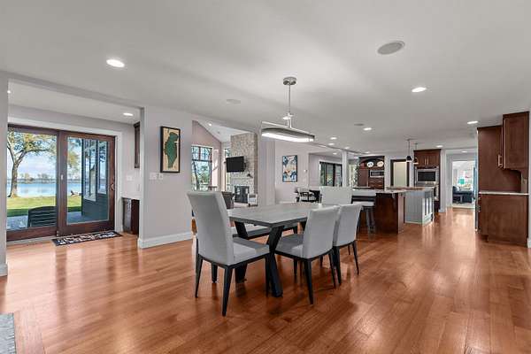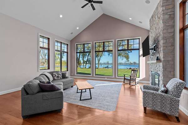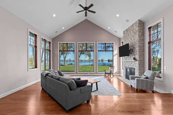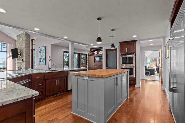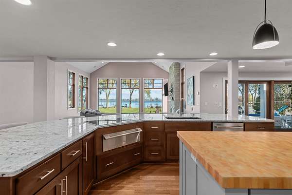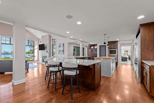 Luxury Lakefront Living! 4-5 bedroom waterfront sanctuary! Open-concept layout seamlessly connects the chef's kitchen, dining area and vaulted great room, where walls of windows showcase breathtaking lake views. This home offers an extensive list of updates. Newly renovated bathrooms add modern elegance, while culinary enthusiasts will fall in love with the expansive chef's kitchen, featuring built-in appliances, a butcher-block island, and a walk-in pantry. Escape to the master suite, a true retreat with a private balcony, cozy fireplace and modern ensuite bath. Professionally landscaped grounds elevate the outdoor experience with a beautiful stone patio, multiple firepits, a pier with boat lift, and kayak launch. This exceptional home is a rare opportunity on Limekiln Dr.