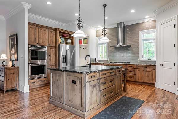 - Bar Fridge, Dishwasher, Disposal, Double Oven, Exhaust Hood, Gas Cooktop, Refrigerator, Wall Oven