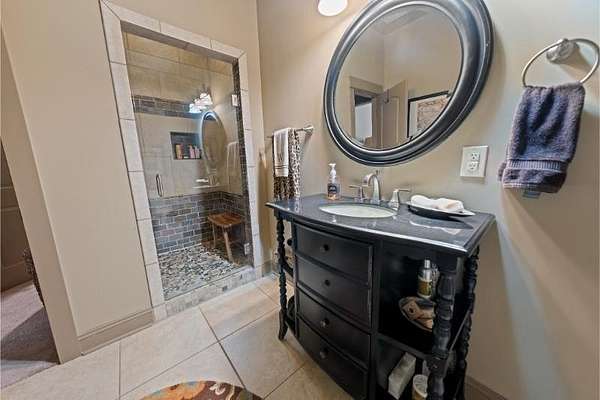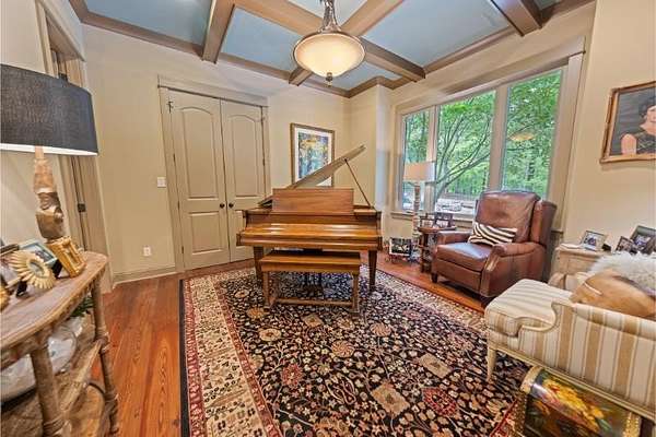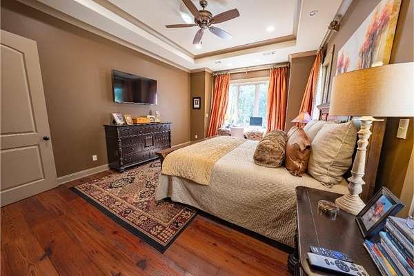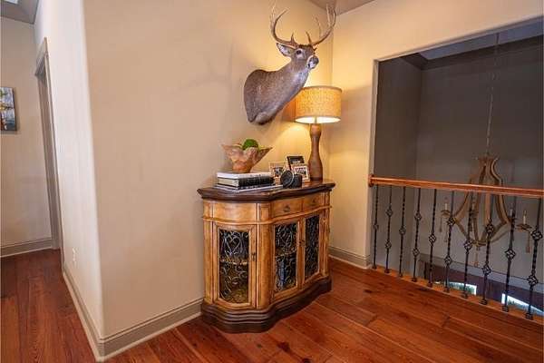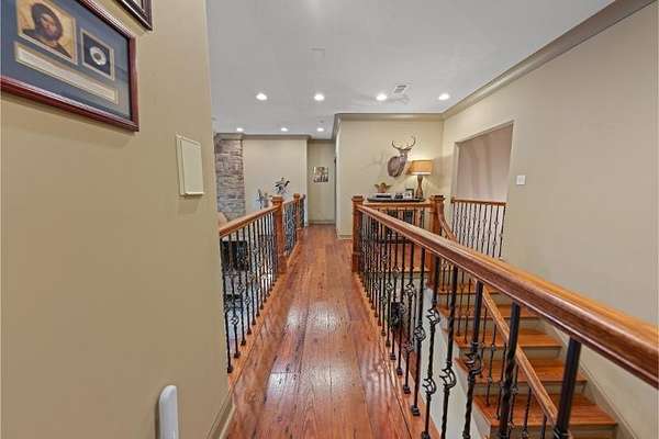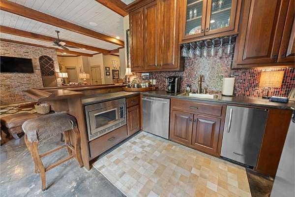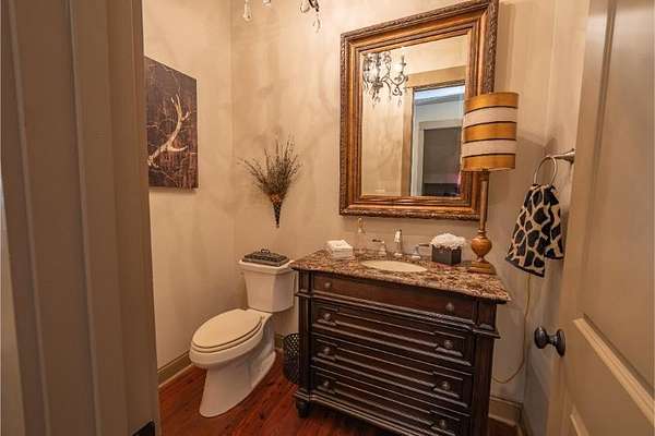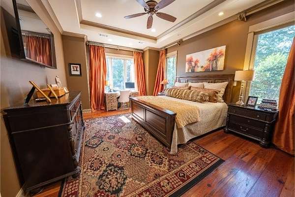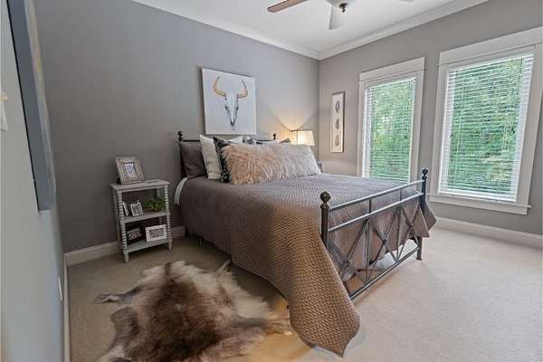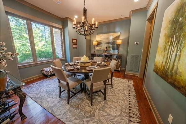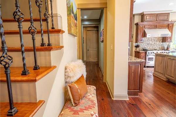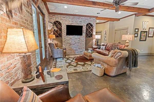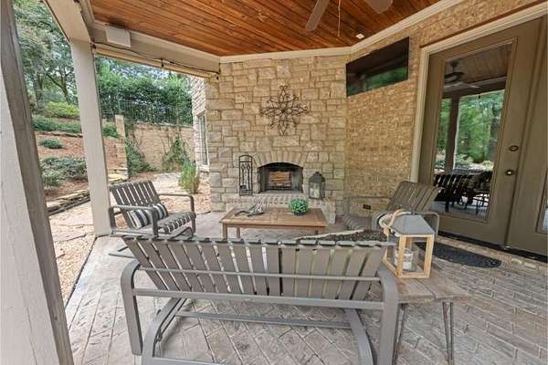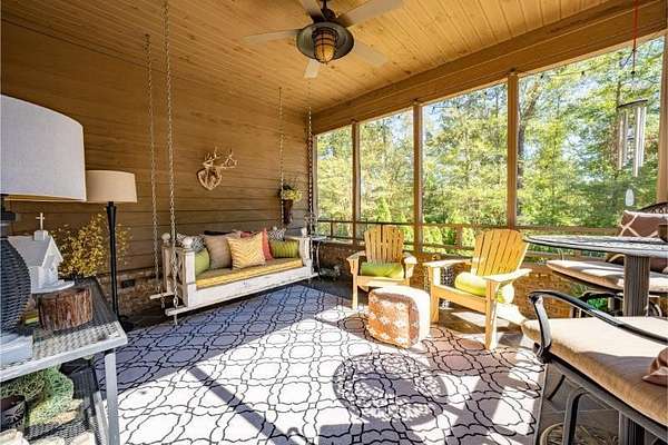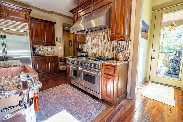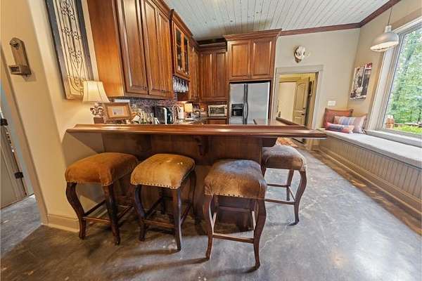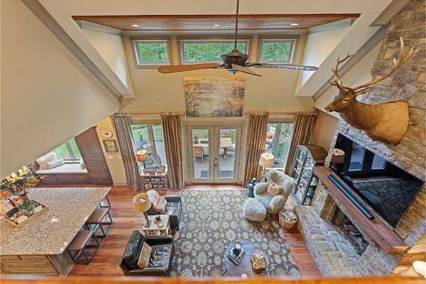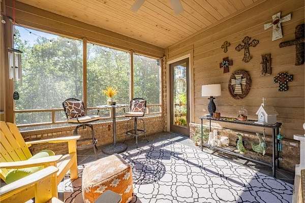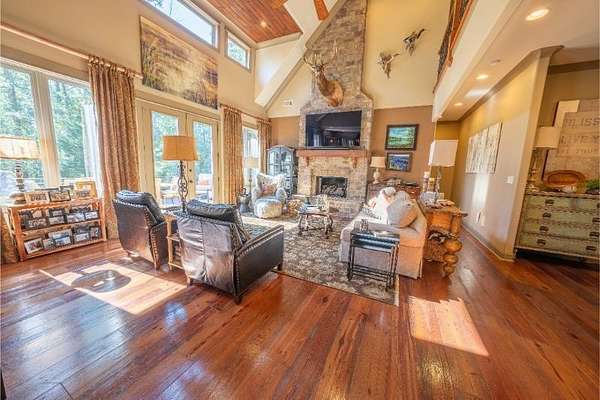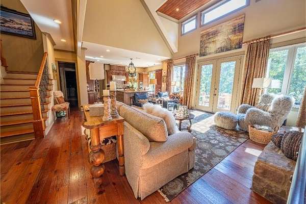 Elegant custom home on 3 acres in a gated community, offering nearly 6,900 sq. ft. of luxury living. The open floor plan showcases reclaimed pine floors, a stone fireplace with gas logs, and a gourmet kitchen with Viking gas range, copper farm sink, custom cabinets, and solid surface countertops. A screened sun porch with swing invites relaxation, while the main-level primary suite features a dressing area and spa-style bath. Upstairs offers 3 bedrooms, each with a private bath. The lower level includes a second kitchen, den with exposed brick wall, storm room, and access to a covered outdoor living area with fireplace. Professionally landscaped grounds feature uplighting and a waterfall. A rare blend of craftsmanship, comfort, and privacy. All info subject to verification.