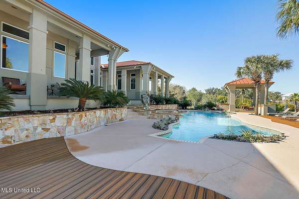 EXQUISITE WATERFRONT HOME HAS EVERYTHING you could dream of! All the details are found in this home from top to bottom. 2.1 acres, this property is located on deep water it has a boat house and lift and only minutes to the Gulf of Mexico. Gorgeous sweeping views and bright light throughout. Large open dining and sitting rooms with full wet bar are perfect for family gatherings and entertaining. Stunning gourmet kitchen fully appointed with top-of-the-line appliances. Walking out to the exterior of the home it is truly like entering a resort. Sparkling, large saltwater pool and spa. Plenty of room to relax and enjoy the outdoors. Two Double garage and double carport. This home is stucco, with metal roof. Beautiful powder coated railing around the pool and exterior porches.