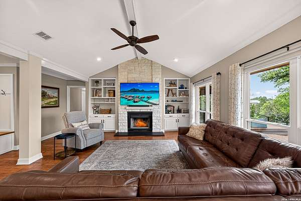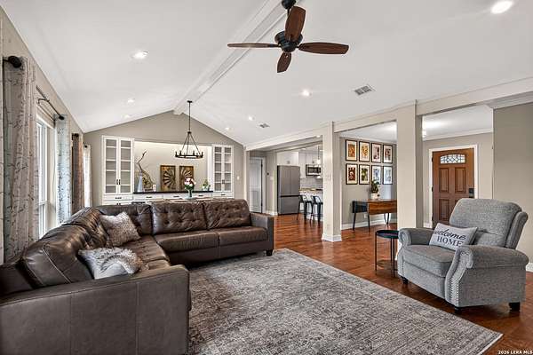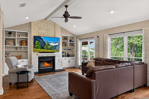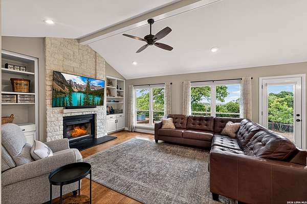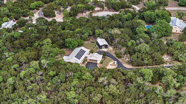 Opportunities like this on Sisterdale Rd are few and far between. Tucked away on a private, elevated flag lot just minutes from downtown Boerne, this Hill Country retreat offers the rare combination of seclusion, views, and convenience-something buyers wait years to find. Surrounded by mature oaks and backing to expansive Hill Country terrain, the property feels miles away from it all, yet sits only a short drive to the heart of Boerne and local favorites like The 1910 church, shopping, dining, and everyday essentials. Inside, the home has been thoughtfully updated with a bright, open layout designed to capture natural light and frame the surrounding landscape. The living area features vaulted ceilings, a striking stone fireplace, and a wall of windows that draw your attention outward-where the property truly shines. The kitchen offers clean, modern finishes with ample workspace and seamless flow into the main living and dining areas, creating an ideal environment for both everyday living and entertaining. Step outside and experience what sets this property apart. A multi-level outdoor living space unfolds behind the home, complete with a covered patio, elevated deck, hot tub, and a separate fire pit area-all positioned to take full advantage of the natural slope and long-range views. Whether it's morning coffee overlooking the trees or evenings spent under the stars, this is a space designed to be used and enjoyed. Adding even more versatility is a fully insulated, spray foam-finished 29x19 detached shop with a mini-split system-perfect for a home office, gym, workshop, or creative studio. Combined with the circular drive, covered parking, and thoughtful layout of the property, it creates a true compound feel with both function and flexibility. Additional highlights include solar panels for energy efficiency, quality construction with a metal roof and limestone exterior, and a setting that prioritizes privacy without sacrificing accessibility. This is more than just a home-it's a lifestyle property in one of Boerne's most sought-after corridors. If you've been searching for space, privacy, and views without giving up proximity to town, this is the one.