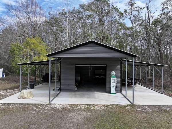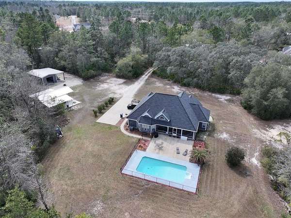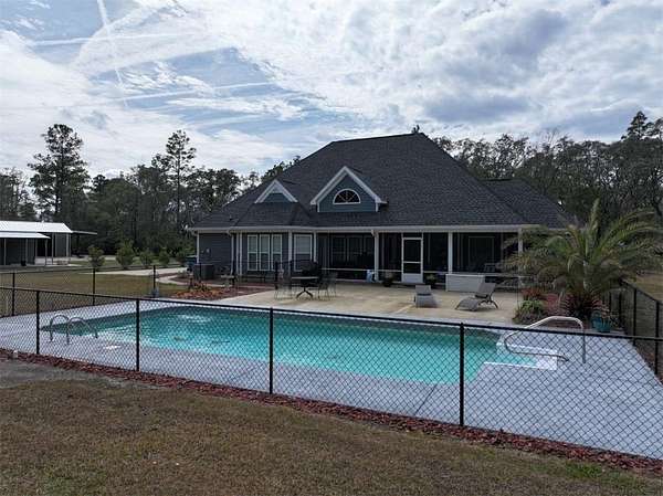Beautiful 3BR/2BA home on 8.59 acres in Oak Island Estates. Features 2,698 sq. ft. (1,698 heated) with a split floor plan and open kitchen with cathedral ceiling, custom cabinets, and granite countertops. Tile and hardwood flooring throughout; carpet in spare bedrooms and closets. Primary suite includes a custom shower, jacuzzi tub, and his-and-hers closets and sinks. Home has a new roof (2022), new drain lines (2025), and freshly painted hardy board siding. Outdoor amenities include a screened back porch, large patio, in-ground saltwater pool (new liner to be installed before closing) with fenced enclosure, and a stocked pond. Property also includes two shops-one red-beam and one with power and water-both matching the home's exterior. Two-car garage with storage room.