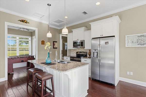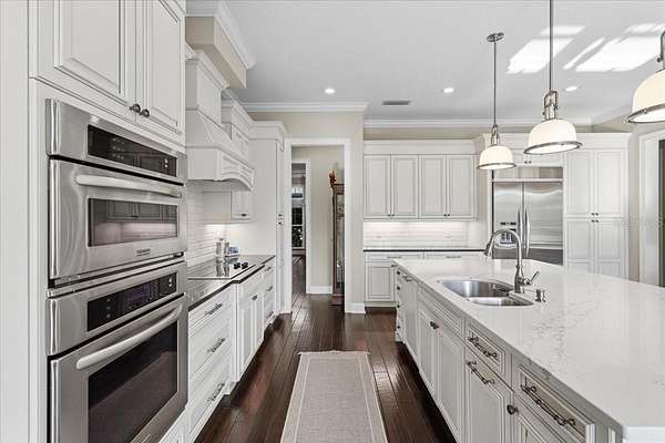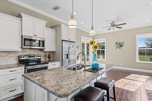 As soon as you enter the main house; you are greeted by a stunning two-story foyer, a view of the formal dining room and leading to the formal living room surrounding a gas fireplace with ornate wood custom mantle & stone covered fireplace. The formal living room has coffered ceilings, built-in cabinetry and French doors leading to a covered brick back porch and paver patio. The kitchen is a chef’s dream kitchen with a spectacular island, quartz countertops, white subway tile, top of the line custom Busby Cabinetry, butler’s pantry and high-end luxury appliances. The kitchen is plumbed for gas if buyer desires a gas range. Off the kitchen is a spacious breakfast nook as well as the family room with a dramatic vaulted ceiling and wood-burning fireplace with custom built-in’s surrounding the fireplace. The primary bedroom is downstairs and has an ensuite bathroom with a walk-in shower, jetted tub, double sinks, and a large walk-in closet with two designated areas. Head upstairs to 3 guest rooms, a bonus room (or 4th guest room), 3 full bathrooms, an impressive office with built-in cabinetry, and a large family room with vaulted ceilings, and a wet bar. All bedrooms have walk-in closets. The main house also features a generator which can power almost 2/3 of the main house in case of power outage. The guest house is perfect for houseguests or multi-generational living as it has 2bedrooms/1bathroom and features an open floor plan, kitchen island, a built-in daybed with storage underneath, and two sets of French doors that lead to a covered patio and fenced yard (separate from the main house). It also has its own generator in case of a power outage. Say goodbye to GRU Electric and enjoy Clay Electric, City of Alachua trash service, high-speed Windstream internet & DirectTV, and Suburban Propane for gas. Interior freshly painted, new flooring installed, new well pump and water tank, new gutters and recently pumped both septic tanks. There are not enough words to describe every detail of this quality constructed custom home by Warring Homes.