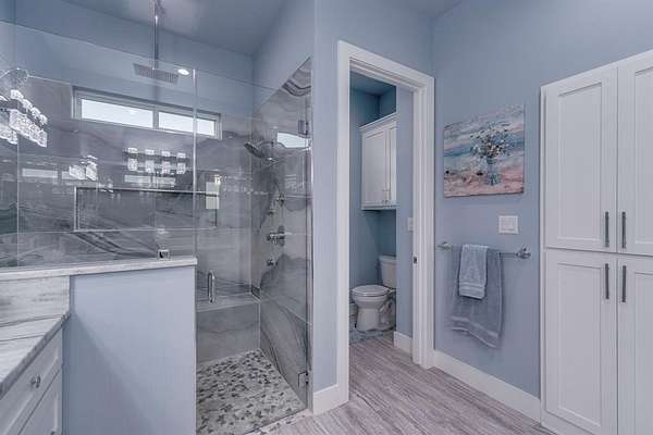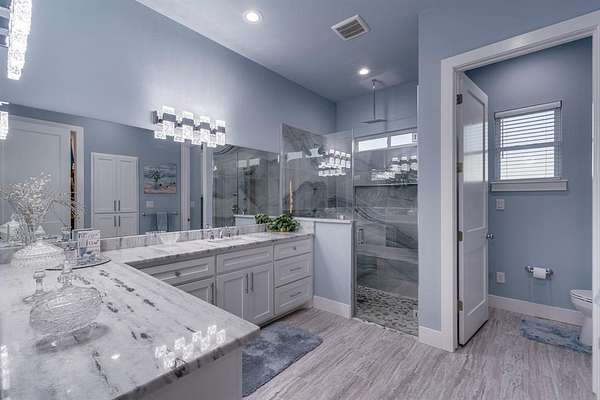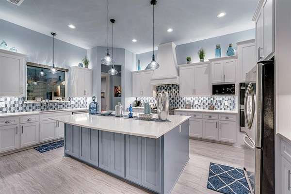 The chef's kitchen is a showstopper, featuring an abundance of cabinetry, an oversized island, stainless steel appliances, Thor propane cooktop, double ovens and a large walk-in pantry. Retreat to the one of a kind master suite, where the bathroom boasts a dream shower with dual body sprayers and a rain head, plus a walk-in closet with built-ins, shelving, and triple rods for maximum storage.