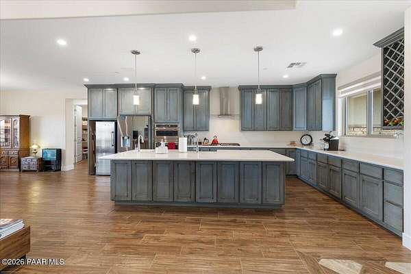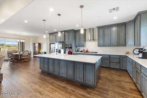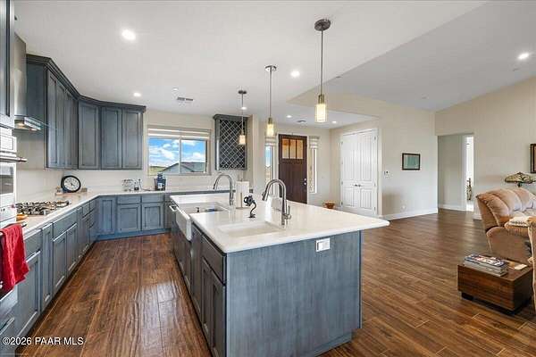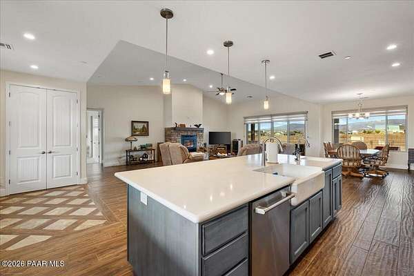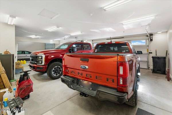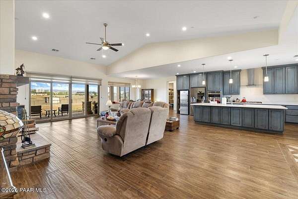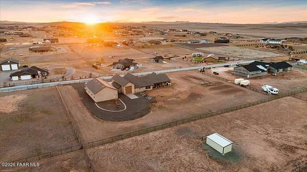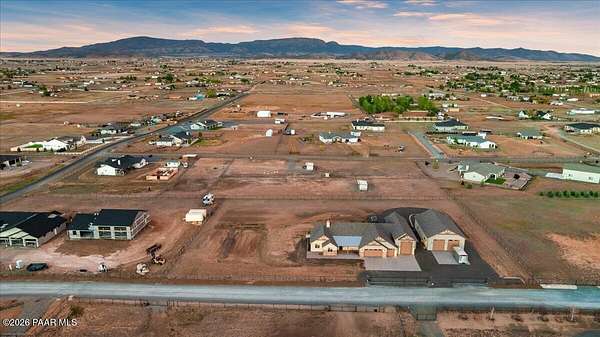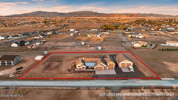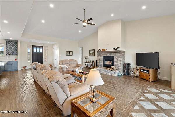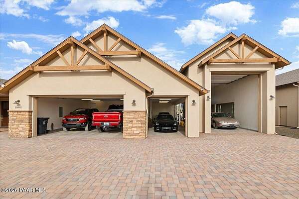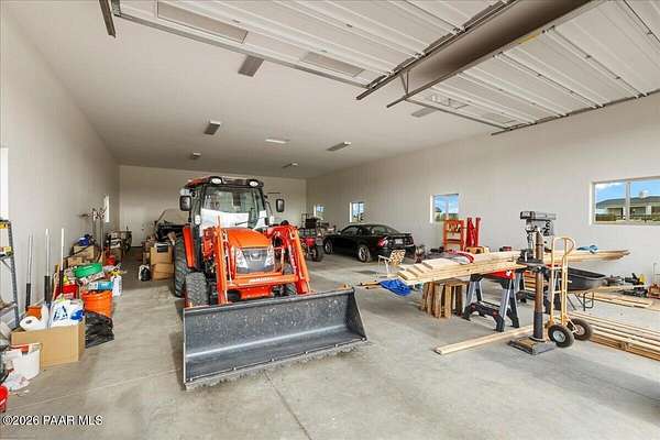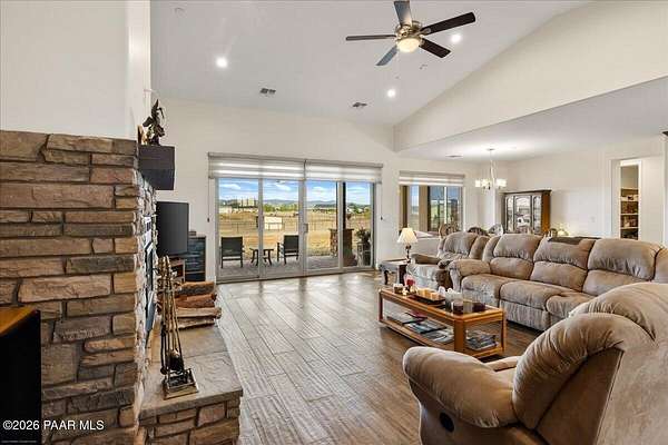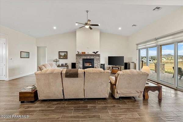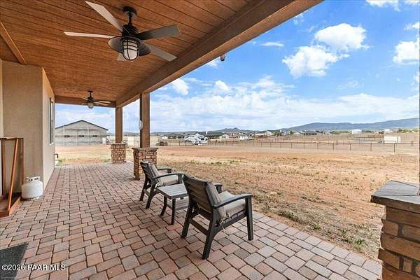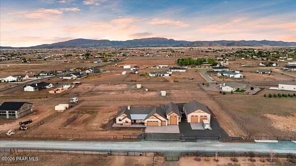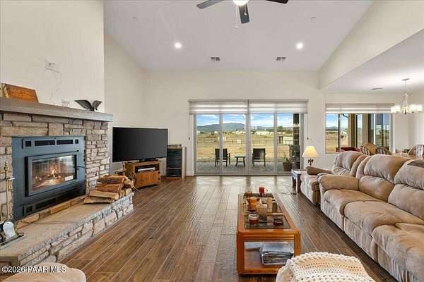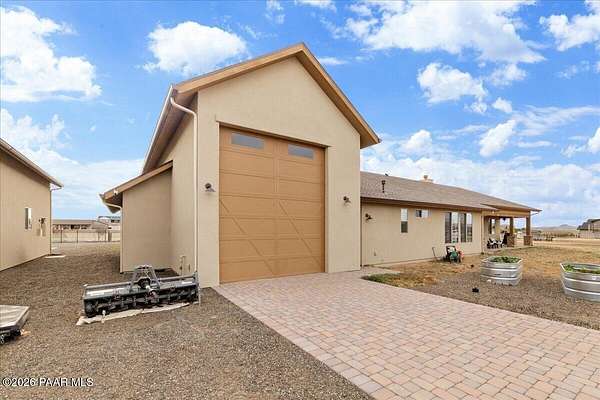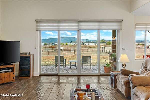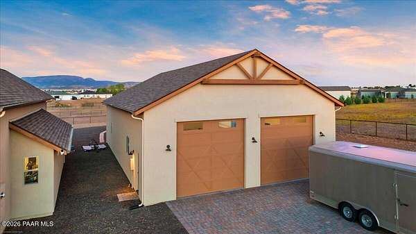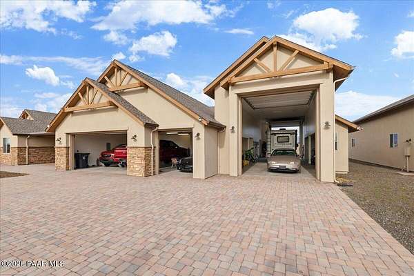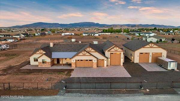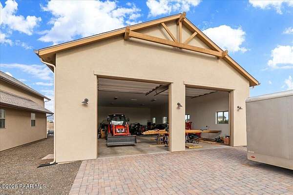 A dream property for the car enthusiast, toy collector, or RV traveler, this one truly has it all. Set on two fully usable, level acres, this impressive property features a single-level custom home built in 2023, offering the feel of a virtually brand-new residence. The stucco exterior with craftsman-style timber gable accents, stone masonry detailing, and an expansive paver driveway make an immediate impression--while the layout of the property, anchored by a single-level home and multiple garage structures, signals that this is a place built with purpose.Inside, the custom inlay flooring in the foyer welcomes you into the open great room that commands attention with soaring vaulted ceilings and a handsome floor-to-ceiling stone wood-burning fireplace that anchors the space. Large sliding glass doors flood the room with natural light and frame unobstructed mountain views, creating a seamless connection between the interior and the covered back patio beyond. Wood-look tile flooring runs throughout all main living areas, offering both warmth and durability.The chef's kitchen is a standout, featuring custom blue-gray glazed cabinetry, a massive island with apron-front farm sink and prep sink, quartz countertops, stainless appliances including double wall ovens and a gas cooktop with designer hood, and space designed for double refrigerators or optional upgrades such as a full-size wine fridge or freezer. Pendant lighting and a walk-in pantry with floor-to-ceiling shelving complete a kitchen built to handle everything.The split floor plan places the generous primary suite privately on one side of the home with direct patio access, mountain views, vaulted ceilings, and plush carpet underfoot. The en-suite bath includes a sleek freestanding soaking tub, frameless glass walk-in shower with floor-to-ceiling tile, dual vanities with matching blue-gray cabinetry and quartz tops, and a dual walk-in closets with one include built-ins.Three additional bedrooms provide comfortable accommodations, each with ceiling fans, plush carpet, and natural light. A second bathroom features a double vanity with quartz countertops and matching cabinetry, plus a tub-shower combination with tile surround. A powder room mirrors the home's clean, consistent finishes. The dedicated laundry room is conveniently located adjacent and with access to the primary suite. It offers a utility sink, both upper and lower custom cabinetry, and full-size washer and dryer hookups.The covered back patio stretches the width of the home and features a tongue-and-groove wood ceiling with dual ceiling fans and stone and wood column accents--an ideal space for outdoor dining with panoramic views of the surrounding landscape and mountains. A sprinkler system is already stubbed out, leaving the backyard a clean canvas ready for landscaping, a pool, or whatever vision comes next.For those who need serious garage space, this property delivers. A 4-car attached garage with oversized bays handles everyday vehicles, while a detached 4-car garage offers additional capacity and a workshop area. Beyond that, a separate RV garage with 57-foot depth, a 14-foot tall door, and drive-through access is purpose-built for oversized toys, equipment, or an RV--and it's large enough to accommodate a tractor and workshop bench simultaneously. Total capacity reaches up to 12 vehicles. The property is fully fenced with no-climb perimeter fencing and a gated entry, supported by a productive 9 GPM well, and zoned to allow farm animals (excluding swine). Accessible via paved roads, this exceptional property is as move-in ready as it is one-of-a-kind.