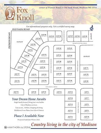 Discover the perfect balance of city convenience and country charm at Fox Knoll, Madison's newest sought-after subdivision! Nestled on the quiet west side and within the Middleton-Cross Plains School District, Fox Knoll offers 74 spacious single family home lots with phase one featuring 50 homesites ranging from .21 to .36 acres. Enjoy serene living with Pope Farm Conservancy and Pioneer Park just steps away. With gently sloping westward terrain and a $7,500 incentive for homes built with alternative energy systems, this community is designed for modern, sustainable living. Bring your own builder or let us guide you through the home-building process. Build-ready by January 2025--your dream home starts here!