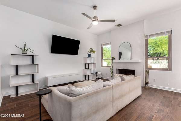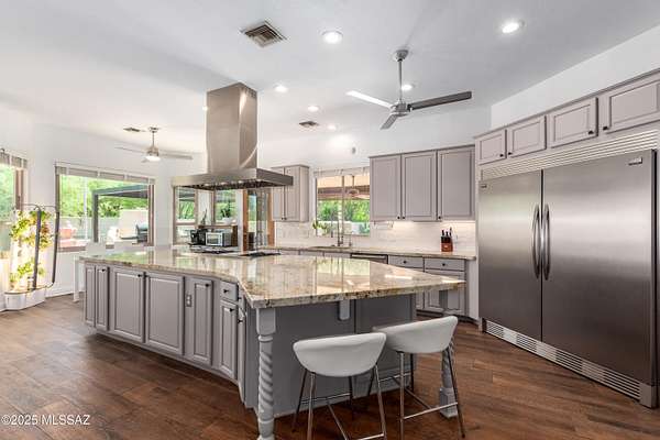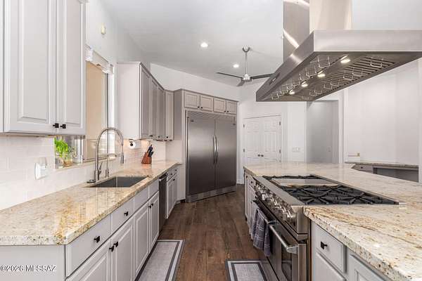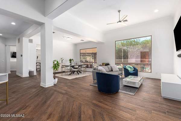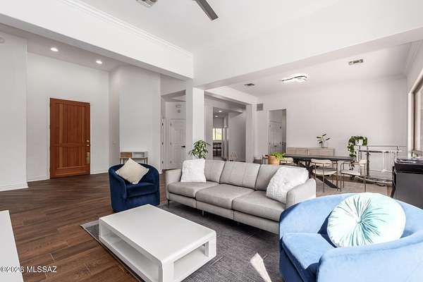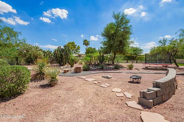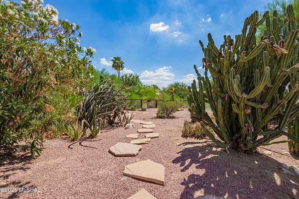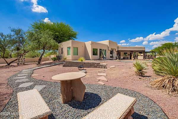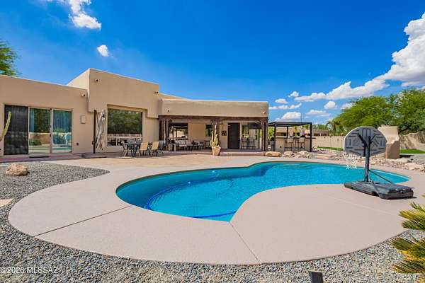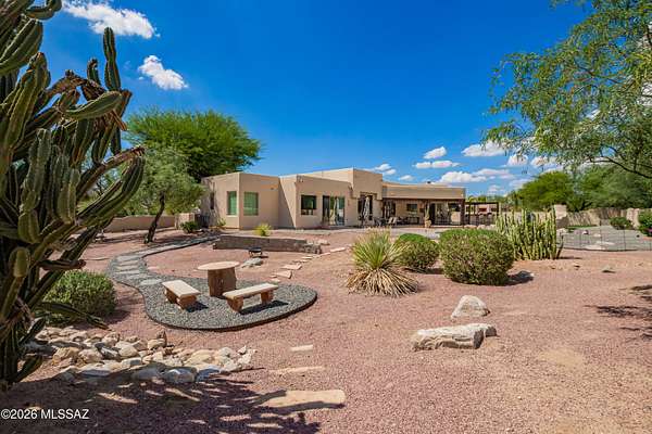 One of the largest lots in Logan's Crossing! This stunning single-level 4BD/3BA home offers nearly 3,000 sq ft on over 2 acres with mountain views and 14 ft ceilings. A gated courtyard opens to a split floorplan and chef's kitchen featuring professional-grade appliances, perfect for cooking or entertaining. Recent upgrades include 300+ sq ft of turf, extended pool deck with pavers, widened driveway, and a newly updated fireplace. Outdoors, enjoy a sparkling pool, outdoor kitchen with built-in BBQ, kiva fireplace, mature cactus garden, and side yard ideal for a golf chipping green. Picture windows fill the home with natural light, while the spacious master retreat captures gorgeous sunrise views. Oversized garage with storage and large laundry room provide everyday convenience. Large almost .5 Acre Fenced yard as well. Rarely do homes combine this level of privacy, upgrades, and lifestyle in one of Oro Valley's most desirable neighborhoods! Energy-efficient, solar adds long-term value.