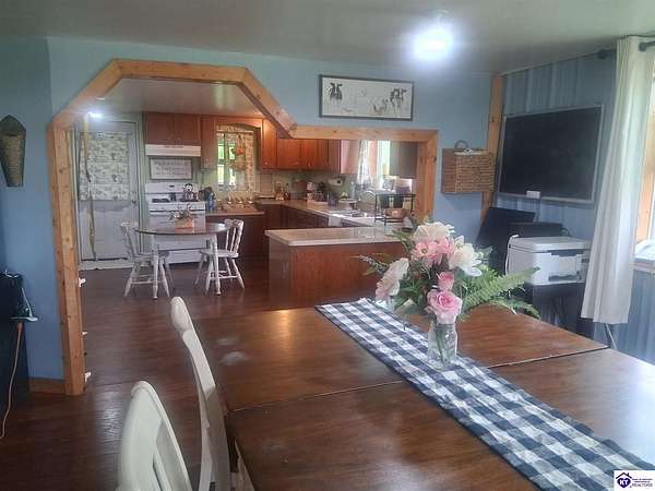 Est $1,669/moCovered porches and country views! Come view this home located near the Boyle/Marion County line in Gravel Switch. Situated on almost 13 acres of land, there is also a pond, multiple fenced pastures, and several outbuildings, including a 24x40 barn with a 10 ft lean-to. The orchard includes peach, pear, apple and cherry trees. There are also blueberries. The house is powered by solar, and the panels are owned and will remain. Make an appointment to view this one in person.