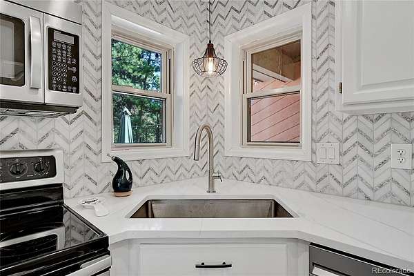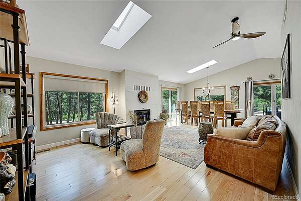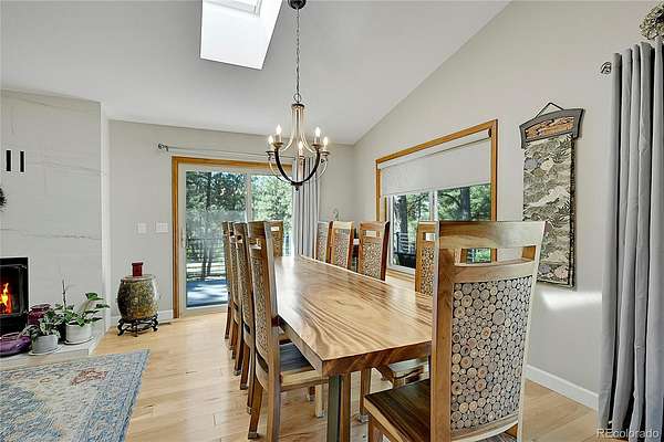 Step inside and immediately notice the bright, open spaces filled with natural light, warm hardwood floors, vaulted ceilings, a new skylight, and expansive windows that frame stunning forest views. The inviting living room features a recently cleaned wood-burning fireplace, creating the perfect cozy atmosphere for Colorado evenings. The updated kitchen is a showstopper, featuring stainless steel appliances, new dishwasher and microwave, quartz countertops, custom cabinetry, a stylish chevron backsplash, and a farmhouse sink positioned to capture the serene outdoor scenery. Custom remote-controlled blinds add comfort and convenience throughout the home.