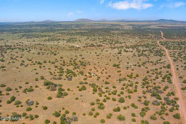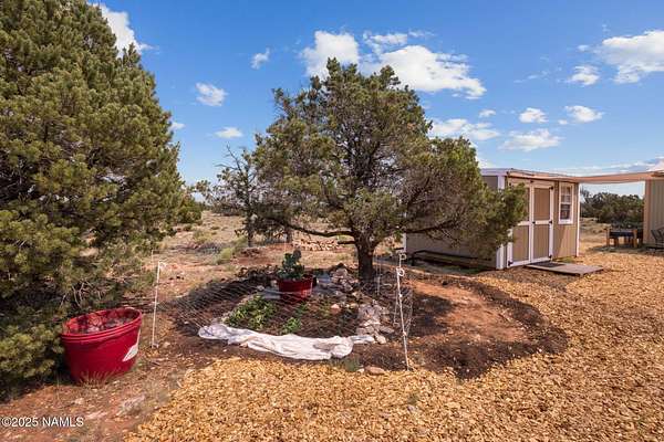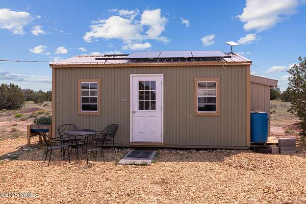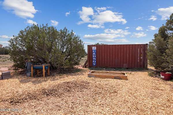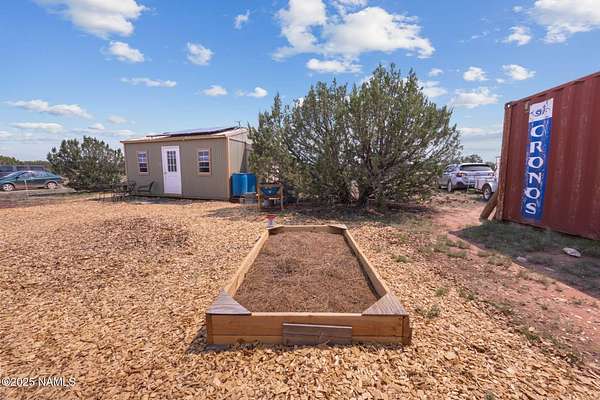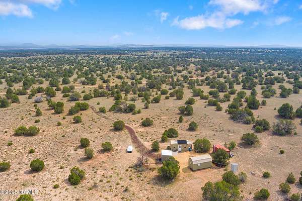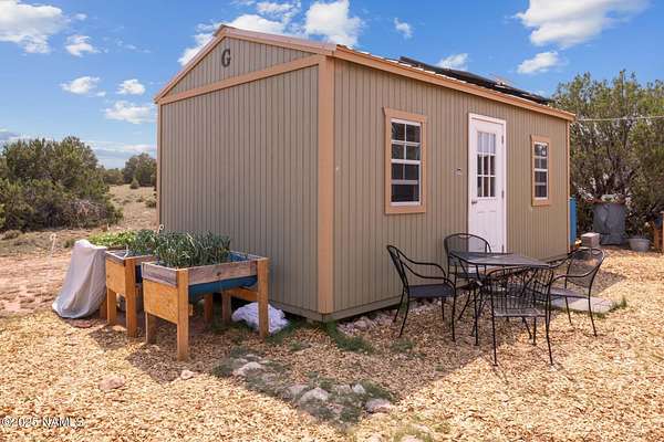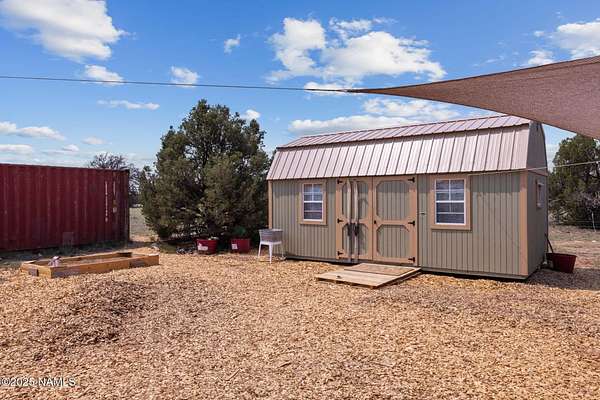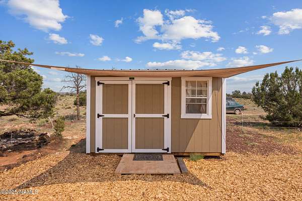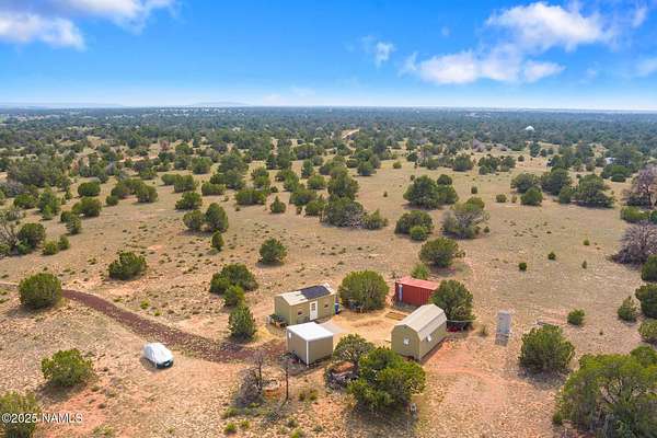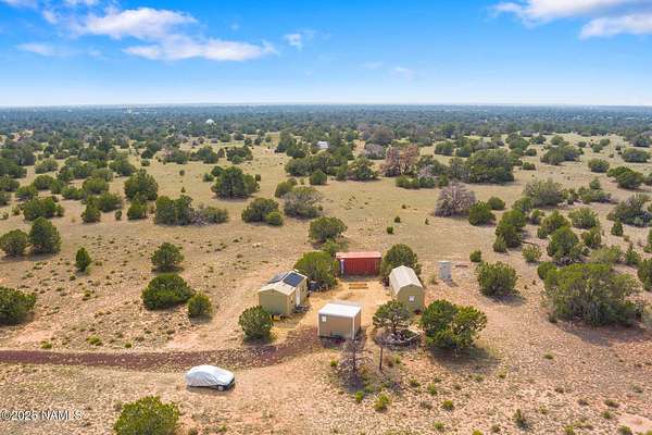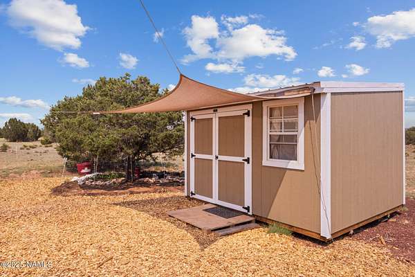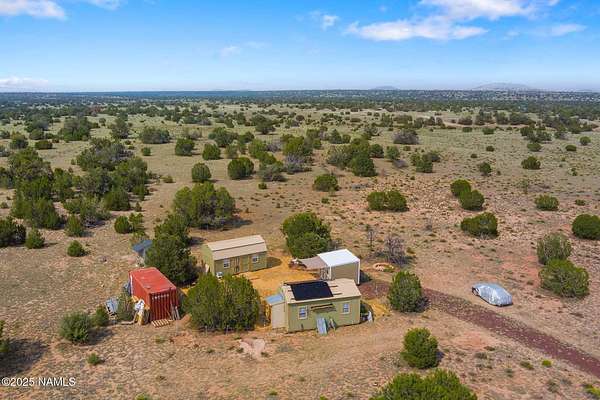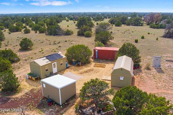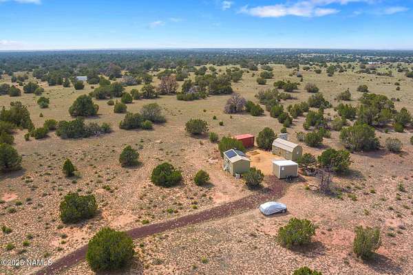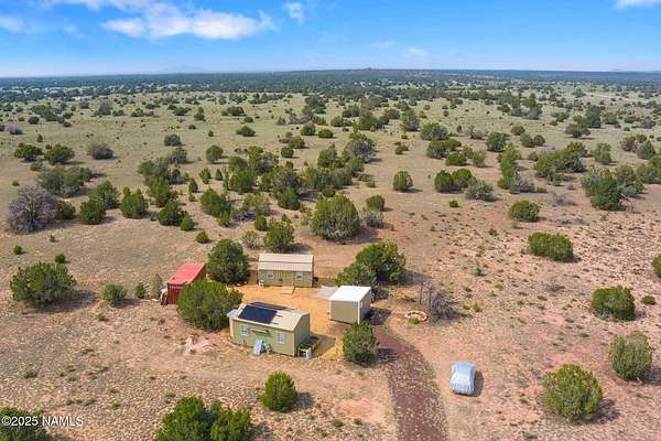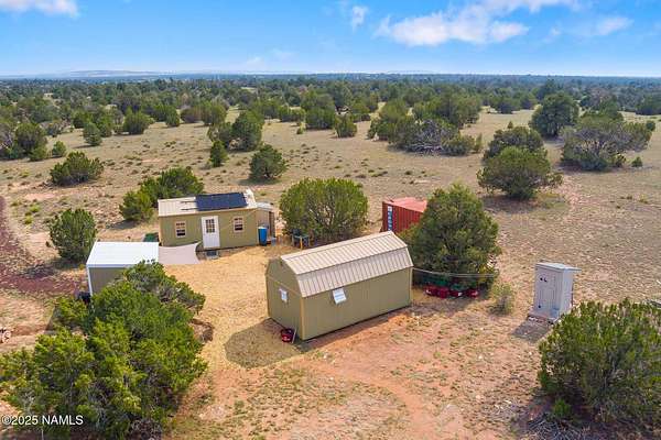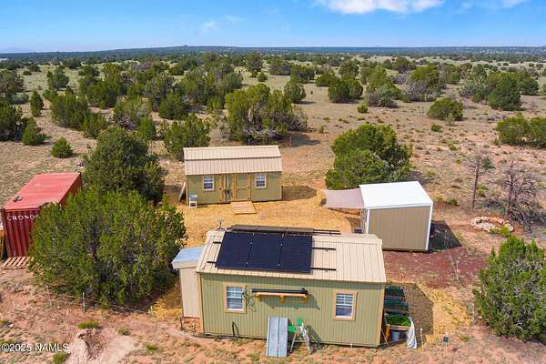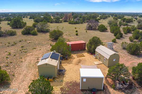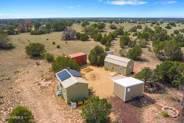 Discover the perfect blend of seclusion, functionality, and natural beauty on this stunning and unique 36-acre property located in the desirable South Rim Ranch. Surrounded by sweeping views of the San Francisco Peaks and the serene high desert landscape, this unique property is an ideal hunting retreat, summer escape from the Phoenix heat, or additional space to your RV while you build a dream home. The property includes three well-crafted outbuildings and a 20-foot shipping container for storage and utility use. The first structure is a 12x20 Graceland building, partially finished with insulation, sheetrock, and paneling, and includes electrical wiring, The second building, also by Graceland, is 10x20, and has basic insulation and an electrical outlet ready for hookup. The third outbuilding, is a 10x12 Freedom Shed. The 8x20 shipping container adds valuable storage, with shelves and various plumbing and electrical supplies. The entire property is powered by a robust 4,000-watt solar system, complete with an industrial-grade lithium battery and six 365-watt solar panels, capable of running major appliances like freezers, a refrigerator, and even a TV without issue. Water needs are supported by a pump and 55-gallon tank, two additional 55-gallon drums, and a 250-gallon tank for hauling water from Valle. Bring your RV and enjoy this expansive property ready for immediate use whether you're looking to relax under starlit skies, observe local wildlife, or start your dream homestead in Northern Arizona. With so much groundwork already laid, all that's left is to bring your vision and make this peaceful off-grid haven your own. Motivated Seller is ready to help turn your dream into reality!