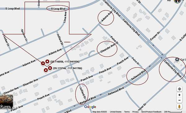 On California Blvd & Redwood, Take redwood west right on Julliard St, left on Oleander. Next lot from across 10448 Oleander St
