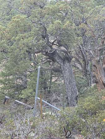 - Sloped, Tall Pines On Lot, Wire Fence, Wood Fence, Wooded