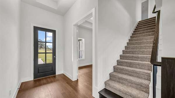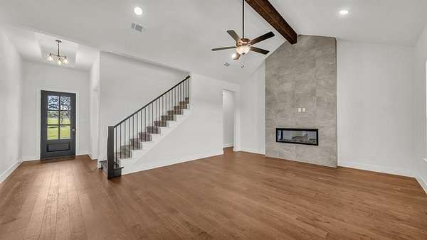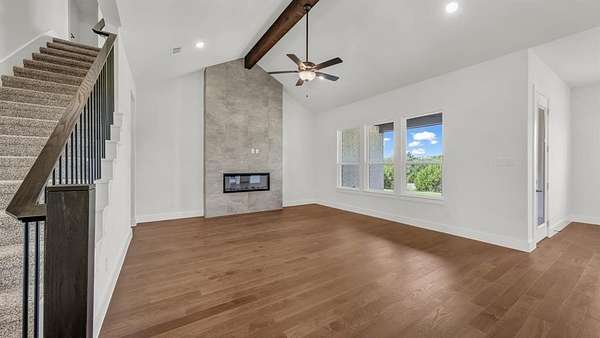 Step into the Hillside floorplan, offering 3,369 sq. ft., 5 bedrooms, and 3.5 bathrooms of luxurious living on a spacious 2-acre lot. Designed for comfort and style, the open-concept layout provides seamless flow between living spaces. The chef's kitchen features quartz waterfall countertops, built-in Samsung appliances, soft-close cabinetry, and a large island perfect for entertaining. The living room, centered around a cozy fireplace, opens to a covered back patio ideal for outdoor dining or relaxation.