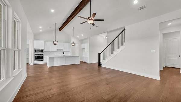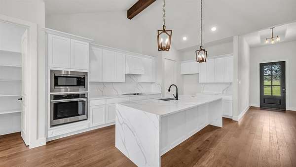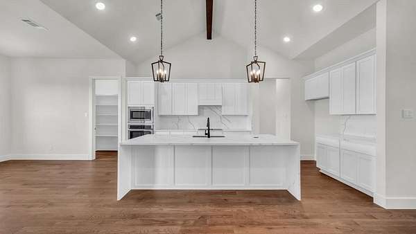 - Decorative Lighting, Double Vanity, Eat-In Kitchen, Granite Counters, Kitchen Island, Open Floorplan, Pantry, Vaulted Ceiling(s)
