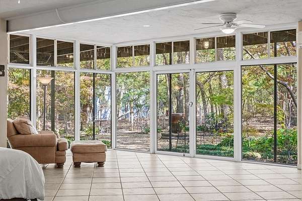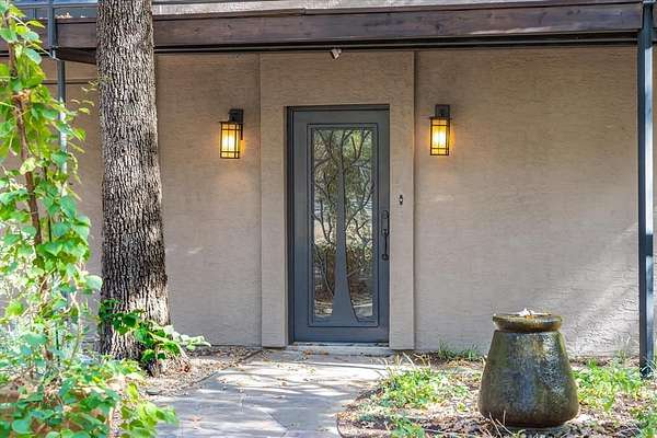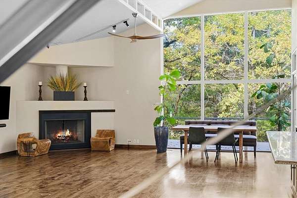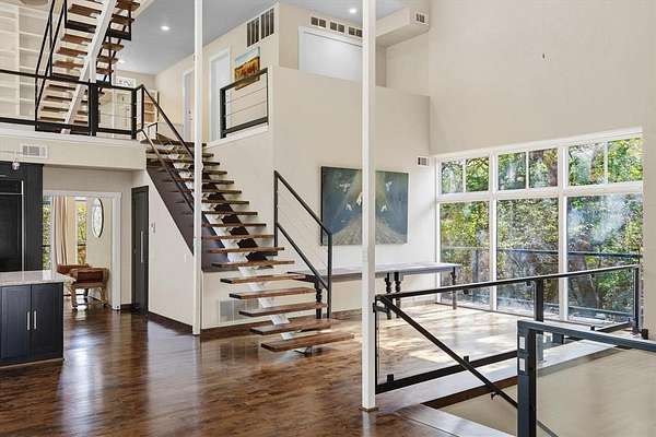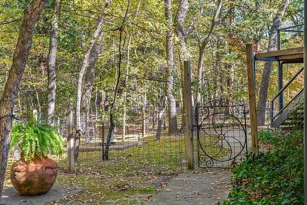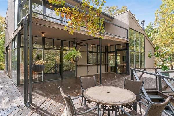 This Modern Stucco home is nestled on 6 rolling acres of private woods with walking trails and a pond. Truly a one-of-a-kind Executive Home where Industrial Chic marries Private Retreat. Walls of floor-to-ceiling windows on every level reveal views of nature and trees. This 4-Story 3-BR 3-Bath home offers a 4 car Gar and 2 possible Primary Suites. It is accessed by a security gate down a winding drive that circles past a picturesque pond with a 2-level covered dock for peaceful relaxation. Possibilities for outdoor life abound with a stone patio centered around a fountain and perennial landscaping on the lower level plus wrap around decks and patio on upper levels. Add to that a fire pit area surrounded by trees, a quaint bridge and trails accessed by whimsical gates. Truly an enchanting Zen-like atmosphere where birds sing and leaves rustle. Enter this almost 4200 sq ft home through an artsy tree-themed front door on the ground level. A hallway off the Entry Foyer leads to a 2nd Primary Suite, also suited as a separate apartment, with a kitchenette and full bath. It's huge room with walls of windows overlooks the flagstone patio. It is rumored a sculptor once lived here and some of her work remains nestled in the landscaping. From the Entry Foyer, move up the floating staircase to the Great Room and Dining with rich hardwood floors, gas log FP, and an open Kitchen, worthy of the most gourmet cook: 6-burner gas range, SS farm sink, built-in frig, and a huge island. Note the view from the Kitchen window! On this main level is the Primary Suite and Bath with a private exit to the decks. Continue up a floating staircase to an open loft complete with metal & cable railing and providing floor to ceiling library shelves for art and books, a lg storage closet and a 3rd bath, all overlooking the main level. From here floating stairs lead to the 3rd Bedroom at tree top level with a private balcony and amazing views. Includes a Workshop with concrete floors and electricity.
