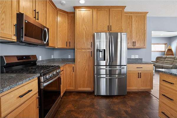 Nothing left to do but move in. The home has three bedrooms, two full bathrooms. Upper level bedroom has a private bathroom and flex room for office or quite place to relax. Kitchen has updated with new cabinets and appliances in 2023 with ample storage and open to the dining room. All new carpet in the bedrooms and luxury vinyl flooring in the living room and 3 season porch. New windows and siding in 2025. Plenty of room to add a large out building. Close to the freeway.