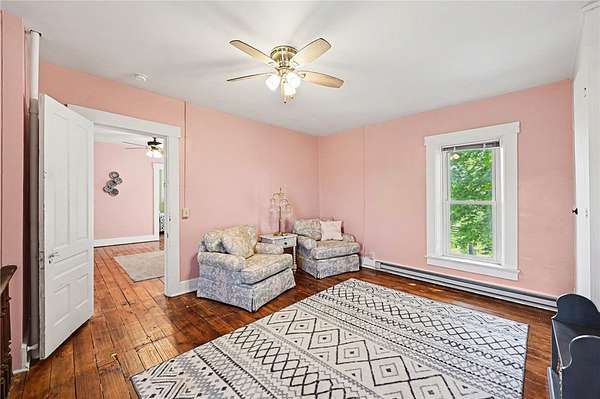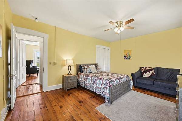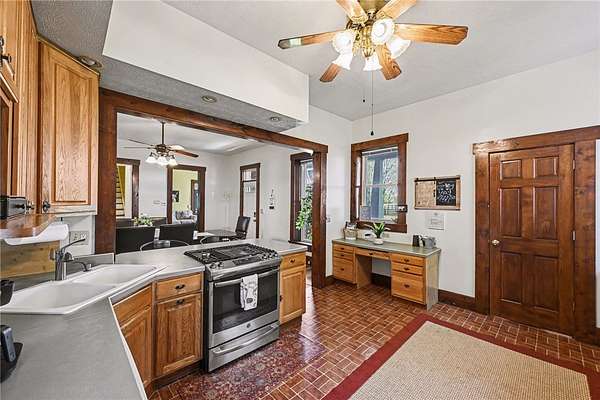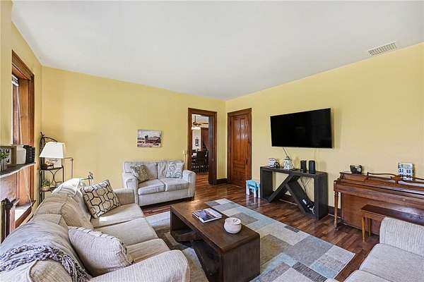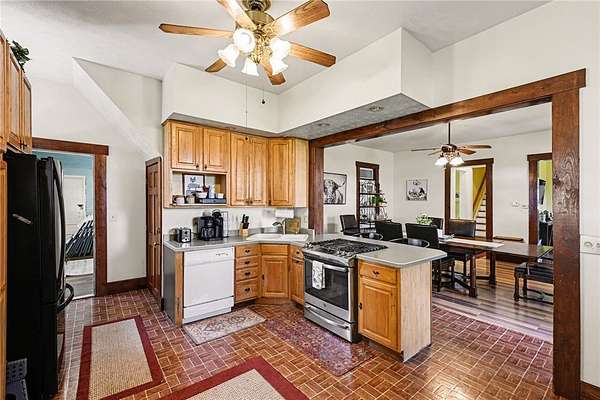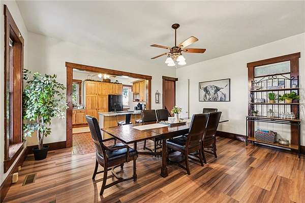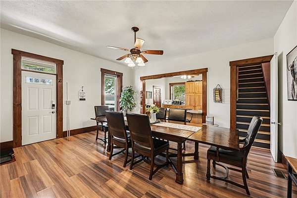 The home features 6 bedrooms and 3 full bathrooms, including two bedrooms and a full bath conveniently located on the main level. The first floor also offers a spacious kitchen with tall cabinetry, ample counter space, and bar seating-perfect for everyday living and entertaining. The kitchen flows seamlessly into a large dining room, creating an open and inviting space for gatherings.