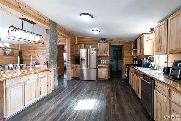 This home, set on a permanent foundation, was completely remodeled in 2022 and offers a warm cabin-style feel throughout. As you step inside, you're welcomed by a huge open living room featuring a cozy pellet stove--ideal for gathering on cool evenings. The stunning kitchen showcases butcher block countertops, a breakfast bar, gas stove, and plenty of workspace for cooking and entertaining. A convenient laundry room is located just off the kitchen for added ease.