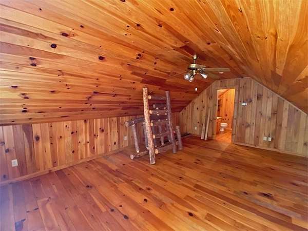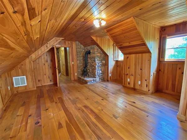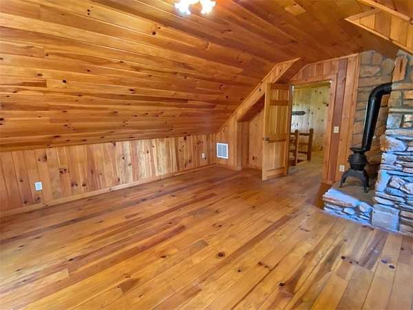 Upstairs are two bedrooms and a full bath, one of them has its own doorway walking out to the covered upper porch that overlooks the lands and the Blue Ridge Mountains. Plus there's a spacious bonus room housing a cast-iron wood stove perched on a stack-stone pedestal. Bring on the hobbies!