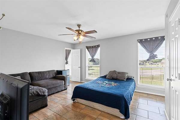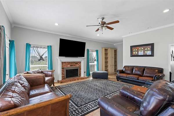 Horses allowed! Best location just 1.1 mile from interstate and outside city limits. The house features a large office with built in shelves, living room with fireplace, built in entertainment center, double French doors leading to patio, and a safe room attached. Enjoy the eat in kitchen with plenty of counter space, pantry, island and a fireplace, extra room could be game room, formal dining, second living, etc. Upstairs the house features 4 large bedrooms. 2 of which have their own bathroom. The huge master has its own fireplace, access to the balcony, dual closets, and sitting area. Master bath has a jacuzzi tub, separate shower and separate vanities. One bedroom has its own bathroom and the other two share a jack and jill bathroom. Roof was replaced July 2025. You have plenty of room outside for all your toys under the 30' x 60' carport with additional parking in the 2car garage. Pull up to your gated property that is entirely fenced and crossed fenced.