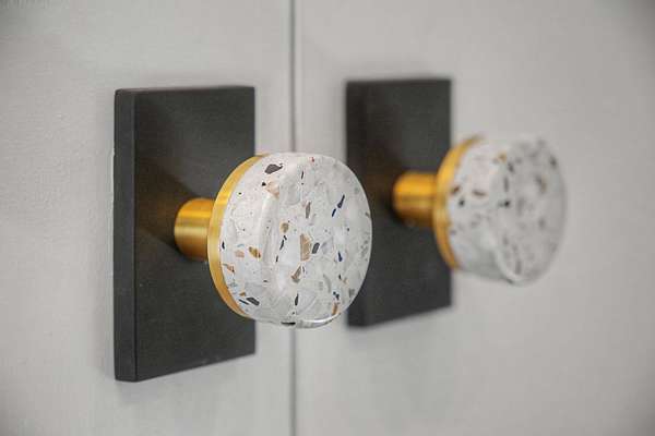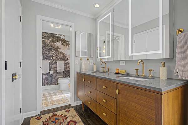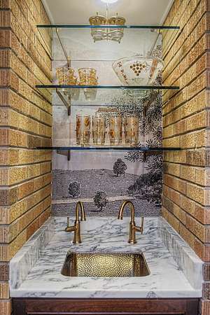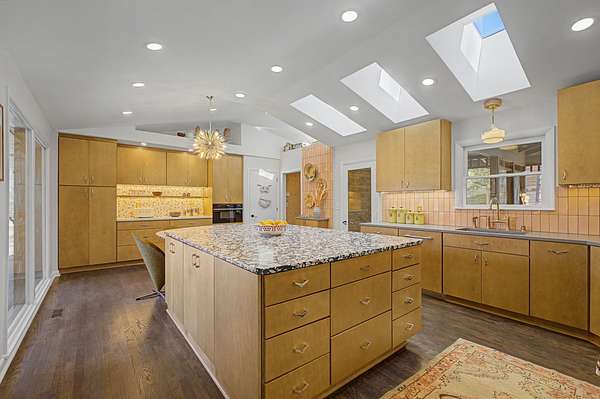 The thoughtfully curated kitchen is both functional and stunning, showcasing a La Cornue range, Wolf microwave, Ann Sacks terrazzo countertops, a handcrafted artisan sink by Thompson, and a striking vintage tile backsplash. Throughout the home, carefully selected designer details—including Schumacher grasscloth wallpaper and Visual Comfort fixtures—add warmth, texture, and sophistication.