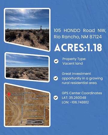 Est $145/moGreat investment opportunity in a growing rural residential area. Good View of the Sandia Mountain. 1.18 Acre lot in Rio Rancho near Rainbow and Sandia.
