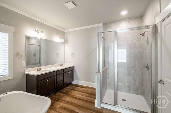 - Cathedral Ceiling(s), Double Vanity, Entrance Foyer, Garden Tub/Roman Tub, High Ceilings, Main Level Primary, Pantry, Programmable Thermostat, Pull Down Attic Stairs, Recessed Lighting, Separate Shower