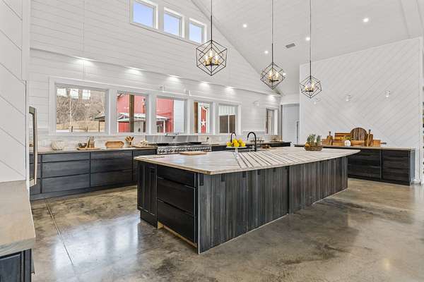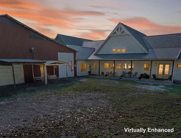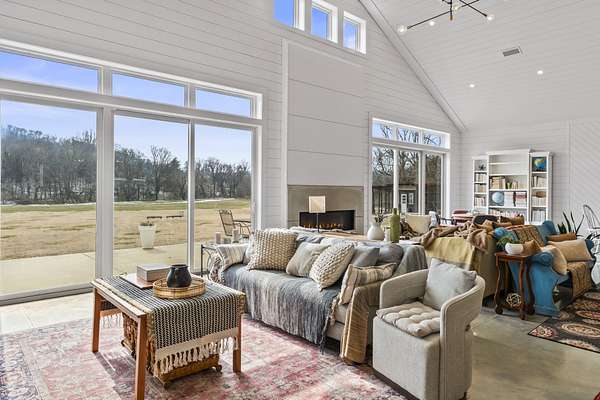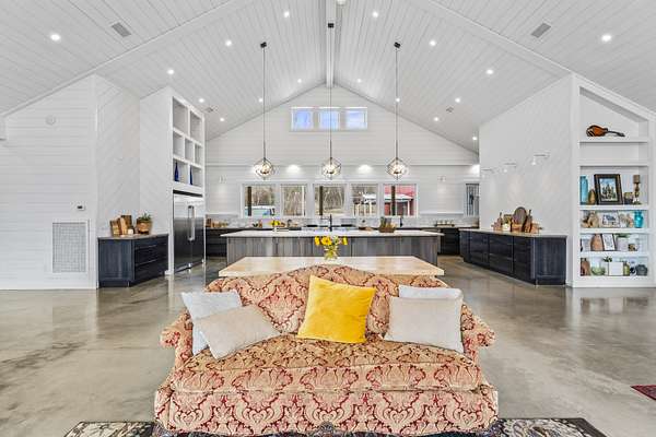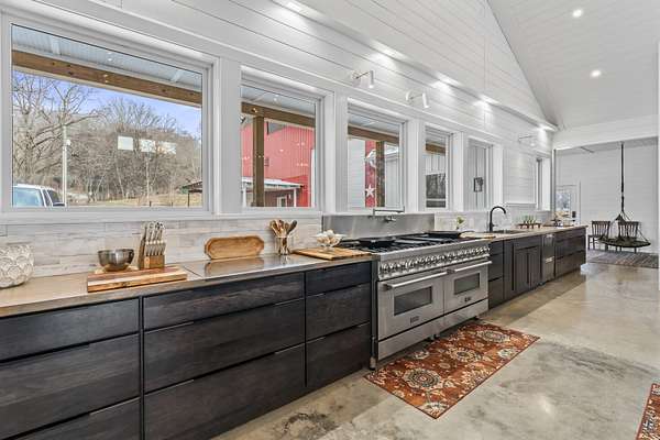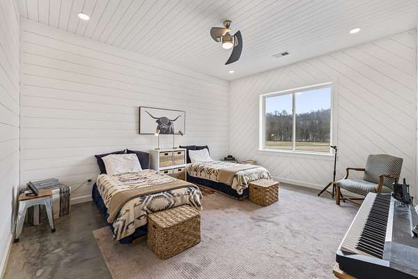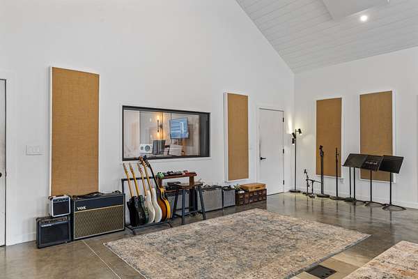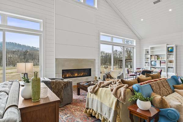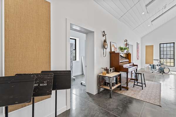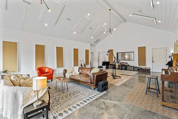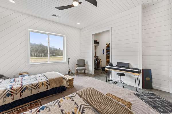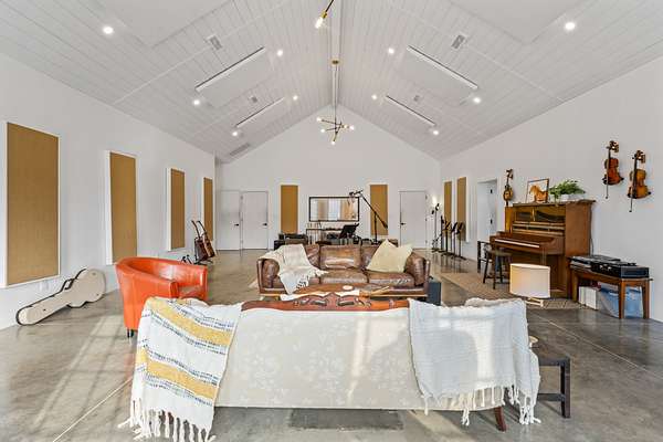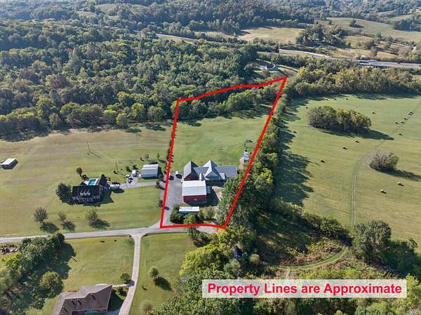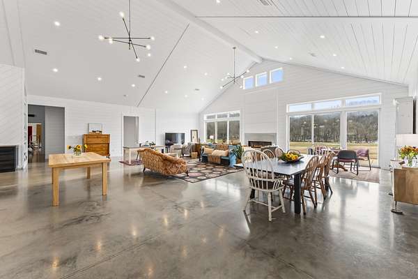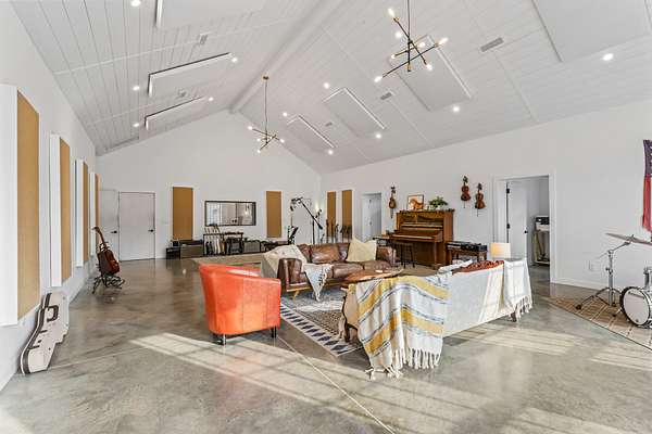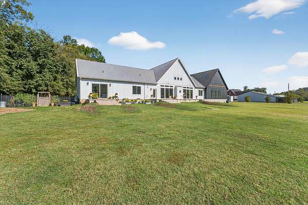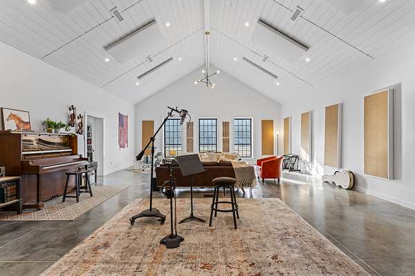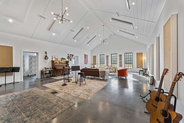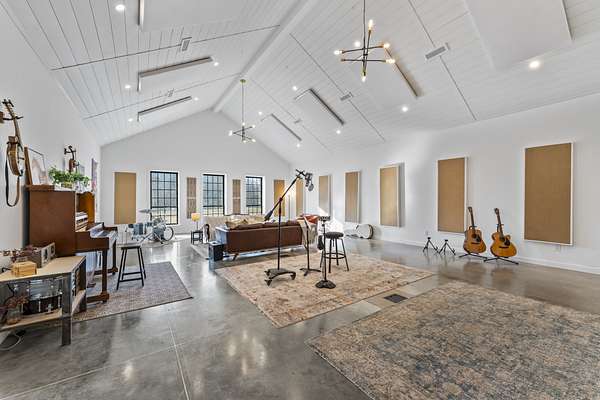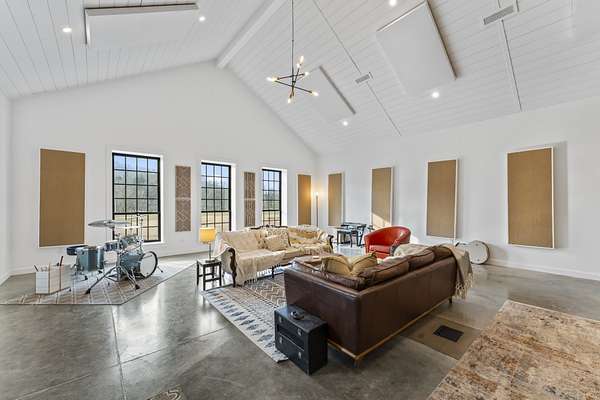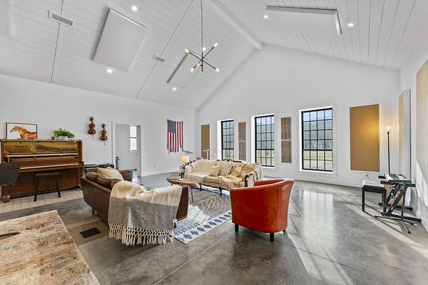 Stunning, custom-designed modern farmhouse w/professional music studio 5 mins. from I-40 and only 45 mins. east of Nashville airport. 7546 sq ft home on almost 6 acres of beautiful, level land w/spectacular view of surrounding hills -- a producer/musician/songwriter's dream haven and homestead. Spacious music studio w/optimal acoustic treatment could also function as media/theatre/family room, and the home is perfect for multi-generational living. This sprawling SINGLE-LEVEL home is thoughtfully-designed w/custom wood finishes throughout -- artfully-designed shiplap walls, extraordinary wood kitchen island, countertops, backsplash, and custom vanities in each of the 4 bathrooms and half bath. Impressive kitchen features 2 gourmet gas ranges/ovens, 2 double dishwasher drawers, 2 extra large sinks, full-size freezer and refrigerator, trash compactor, huge pantry w/refrigerator. 54 cabinet drawers provide ample storage for cooking and entertaining! Massive kitchen island features hidden play area/storage underneath. Spacious, light-filled great room w/soaring ceilings, 2 dining areas, 3 seating areas, library space, and linear gas fireplace w/custom concrete surround. Each of 4 generously-sized bedrooms has its own bath. Primary bedroom w/private entrance to patio overlooking back yard. Primary bath offers grand walk-in shower, gorgeous clawfoot tub, and farmhouse sinks. Two more baths offer walk-in showers, while the other boasts gleaming cast iron tub/shower. Huge laundry/mud room w/2 washers, 2 dryers, giant stainless utility sink w/entrance from 40x12 patio overlooking back property -- which includes chicken coop/garden shed, 4 fenced henyards and garden areas. Enclosed breezeway connecting home to studio and barn is large enough for 3 swings, exercise equip.,and sunny sitting area. 50x60 drive-thru barn for RV, 3 cars, workshop. Sep.1BR 1B apt. for guest retreat. 5-acre invis. fence for dogs. RV hookups, studio loading dock, covered front porch, room for a pool!
